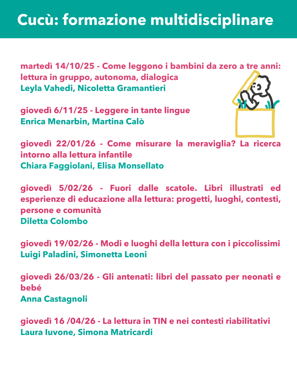 La formazione inaugura il 14 ottobre con l’incontro Come leggono i bambini: lettura in gruppo, autonoma, dialogica. Leyla Vahedi dell’associazione Cartastraccia illustra brevemente il progetto Cucù: libri della meraviglia, presentando la selezione bibliografica delle scatole che viaggeranno nei vari contesti. Immaginando scenari e modalità d’uso, dialogherà con Nicoletta Gramantieri, (Biblioteca Salaborsa ragazzi) sulle modalità di lettura della fascia di bambini da zero a tre anni: lettura condivisa, lettura dialogica, lettura autonoma. La riflessione sul bambino lettore e sulle modalità con cui la lettura prende corpo in età precoce continuerà nel corso della formazione, anche con Gigi Paladin.