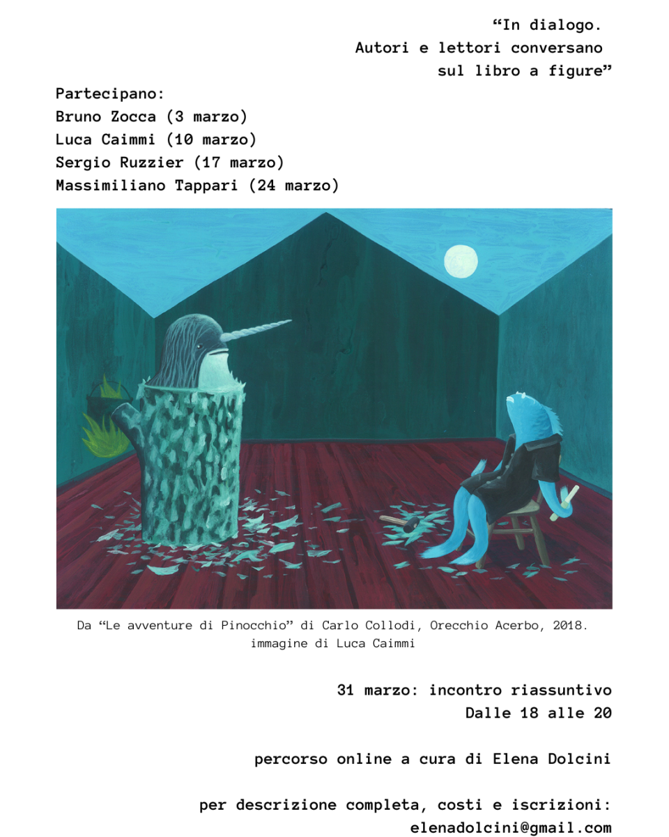 10 marzo: Luca Caimmi parlerà di un libro di cui è autore delle figure, Le avventure di Pinocchio, con testo integrale di Carlo Collodi (Orecchio Acerbo, 2018), soffermandosi sul significato e i risvolti pratici del lavorare su un classico per eccellenza. Con Luca discuteremo intorno al binomio “uno-sequenza” per esplorare la relazione non solo tra un’immagine e le altre che compongono un libro, ma anche il lavoro a parete di Caimmi.