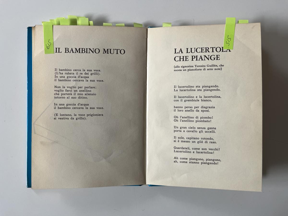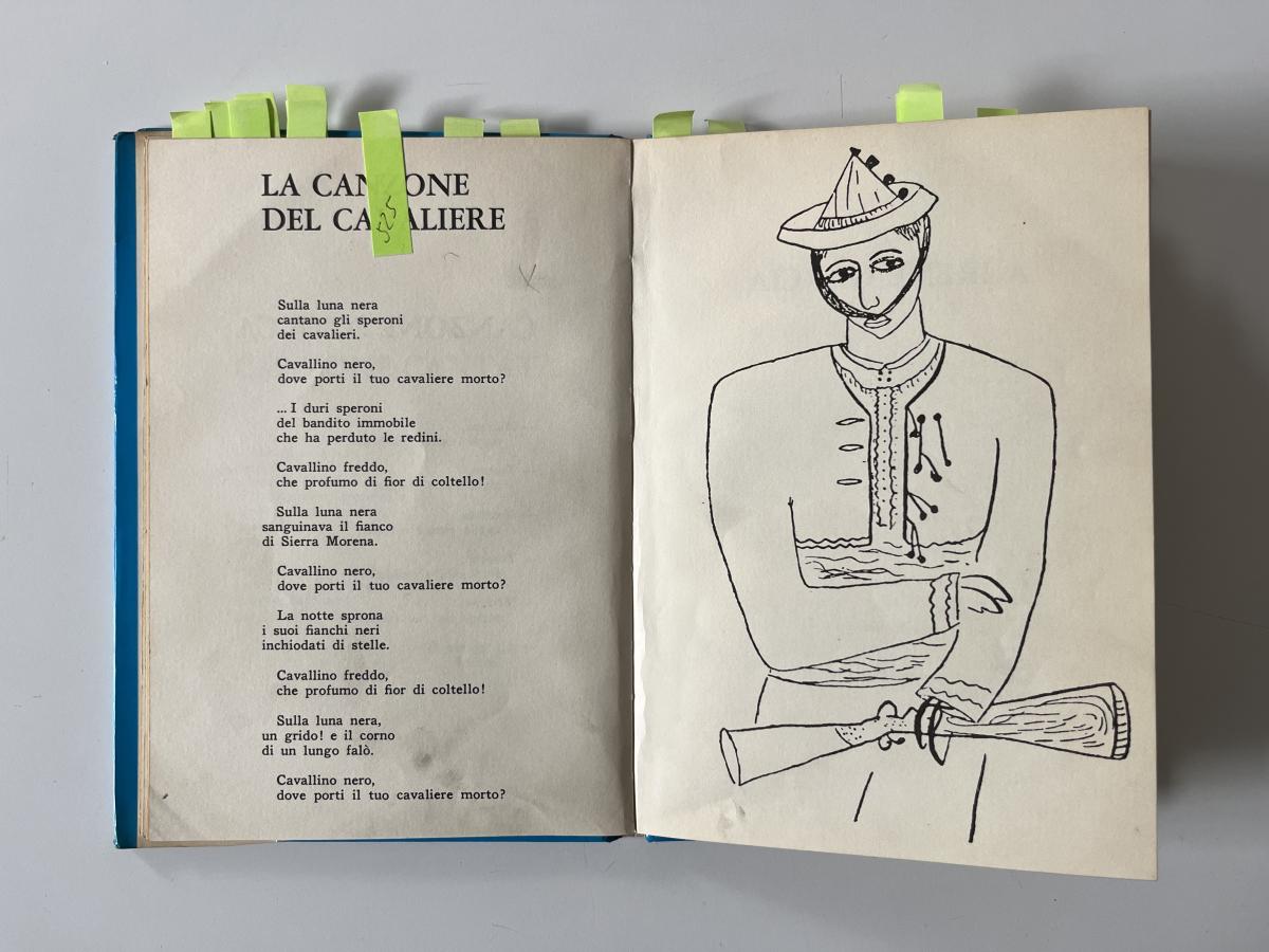 Ho tradotto pensando a un Lorca che scrive assecondando il suono. Che scrive dopo una serata passata a destreggiarsi al pianoforte, che scrive ricordando i canti flamenchi e la bandurria del prozio Baldomero, che scrive sulla scia delle filastrocche che animavano i girotondi con i suoi cugini. Che scrive pensando a leggere, o a recitare, ad alta voce. Il desiderio è che quella voce risuoni ancora, oggi, attraverso le vostre.