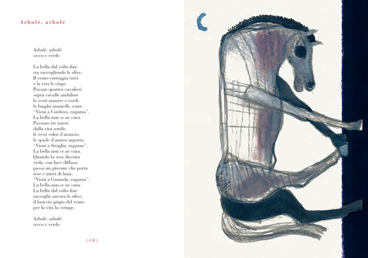 La ricerca di quello sguardo bambino ha guidato la selezione delle poesie della raccolta. Sono quasi tutti componimenti giovanili, scritti da un Lorca ventenne, nei primi anni ’20 del Novecento. Testi in cui la fantasia cristallina del poeta illumina una quotidianità fatta di campi di grano e uliveti, di mattinate a scuola, di storie e giochi condivisi; poesie in cui i pioppi danzano, i bambini mangiano la luna, la giostra è un tulipano e l’acqua del fiume suona un tamburo d’argento. Ma anche poesie in cui emerge uno sguardo inquieto, pieno di domande: sul mistero della vita e della morte, sulla connessione con la natura, sulla perdita, sul cambiamento, sulla spiritualità, sull’amore.