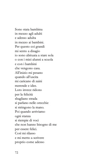 «Nel libro di Letizia Soriano (insegnante, appassionata di pedagogia, ricercatrice di storie che raccontano la scuola, interessata da sempre all’intercultura, formatrice, sia in Italia sia all’estero, all’interno di progetti di Cooperazione Internazionale per la promozione dell’inclusione sociale) si sente l’odore dell’infanzia, la propria e quello delle altre infanzie che l’autrice incontra. Tove Ditlevsen, in un altro passaggio del suo meraviglioso libro, scriveva anche “l’infanzia è lunga e stretta come una bara, e non si può uscirne da soli” ecco che se torno su questo passaggio leggo meglio le incursioni dei bambini nei versi di Letizia.»