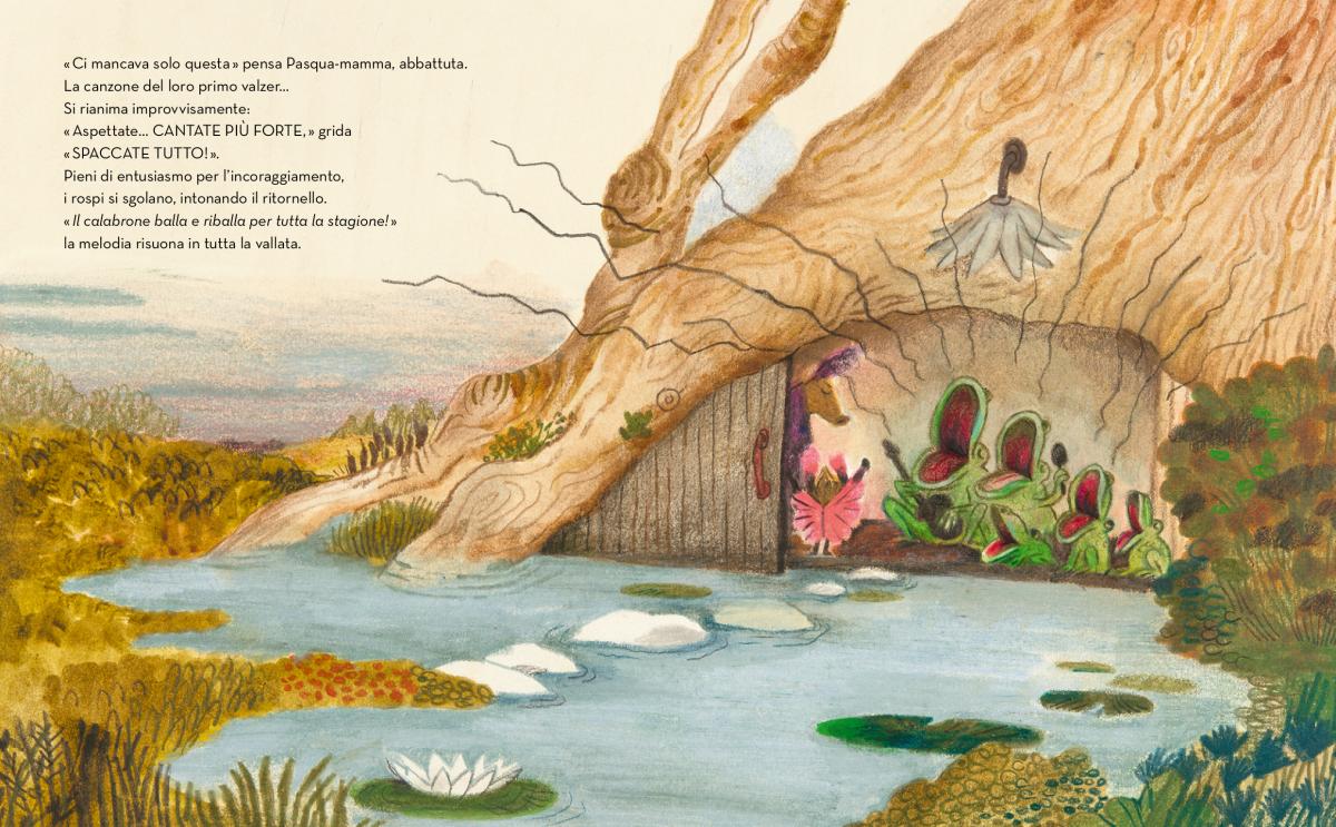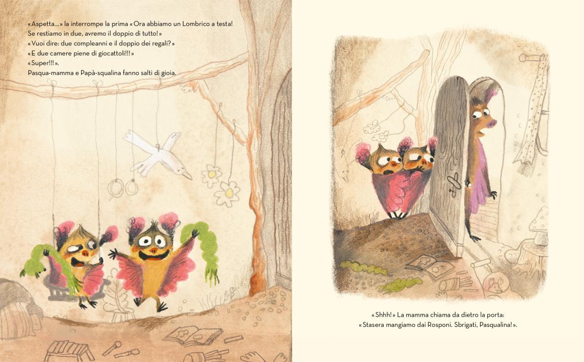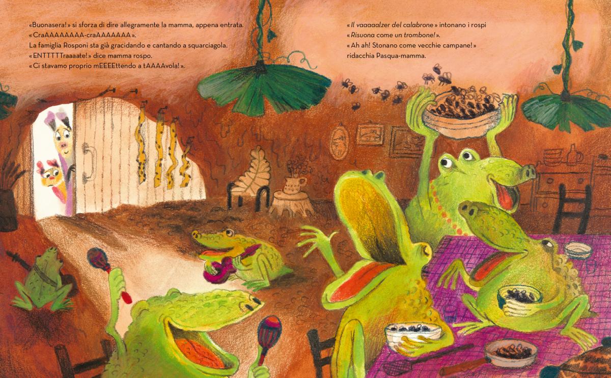 Il dissidio tra gli adulti, però, continua e conduce a un momento di separazione: per cambiare aria la mamma trascina una riluttante Pasqua-mamma a cena dalla gracidante famiglia Rosponi, mentre il papà rimarrà a casa con Papà-squalina a gustarsi i grilli fritti. Ci penseranno la musica e la danza, con la loro meravigliosa forza evocativa, a metter lo zampino nella riconciliazione tra i due, ma non vi sveliamo come per non guastarvi la sorpresa (e la dolcezza) di scoprirlo da soli. E le Pasqualine, rimarranno così, sdoppiate? Vi basti pensare che, di fronte all’angusto dilemma del dover scegliere tra chi dei due genitori abbia alla fine avuto ragione, le pipistrelle prenderanno una saggia decisione, come spesso sono capaci di fare i bambini nei loro perenni equilibrismi, in bilico tra desideri e realtà.
