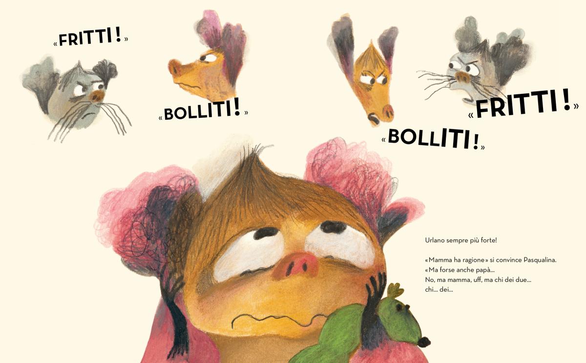 Quella narrata in Chi dei due è ancora una storia di parapiglia quotidiani tra grandi e piccini, e di sentimenti contrastanti: i litigi tra genitori sono a tutti gli effetti, nelle giornate bambine, tra le esperienze più difficili da gestire, e fanno male. Alemagna ha rappresentato i sentimenti di Pasqualina, nel suo universo gioioso e imperfetto, con il consueto estro antiretorico che la contraddistingue: se è vero che la pipistrella e i suoi genitori non si abbandonano certo a toni drammatici o violenti, è pur vero anche che il conflitto c’è a tutti gli effetti, borbotta e si accresce, scatenando nella piccola protagonista una reazione, anche fisica, che ben risponde a quella sensazione ingombrante di sentirsi tirati da una parte e dall’altra che si prova da piccoli a stare in mezzo alle discussioni dei grandi. Pasqualina si allunga, si tira come un elastico perché le grida dei due adulti la fanno arrabbiare e pensare di non sapere che pesci prendere e con chi dei due schierarsi, ma la vivacità e la leggerezza di tutto lo strampalato mondo che la circonda (compresi i Rosponi con le loro voci stonate e le maracas da scuotimento) trasformano il disagio e la tristezza da litigio in un momento tenero e spassoso allo stesso tempo.