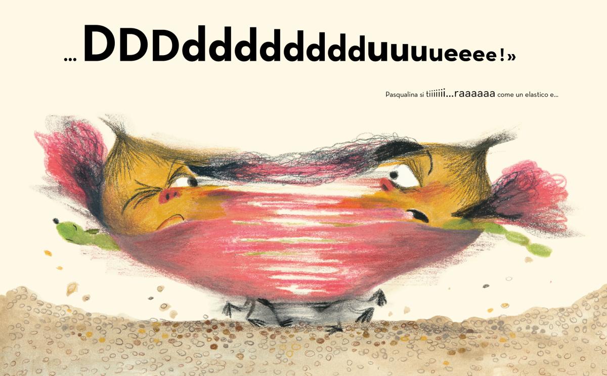 Un motivo futile per litigare, ma tant’è: d’altronde è vero o no che spesso, tra gli adulti, funziona così? Mentre i due brontoloni si perdono in grida intorno ai fornelli Pasqualina ricorre a uno dei suoi movimenti preferiti: si stira a più non posso!  Già in Manco per sogno lo stiracchiamento ci aveva colpiti perché era il movimento dei suoi genitori alla fine della storia, nel momento in cui ritrovavano le loro reali dimensioni dopo essere stati ridotti a piccolissimi, e come dimenticare quella sorta di ripetuto stretching sbavoso che fa Pasqualina dal carrello della spesa verso la mamma in Il top del top, pregandola di comprarle le più nefande schifezze offerte dagli scaffali del supermercato?