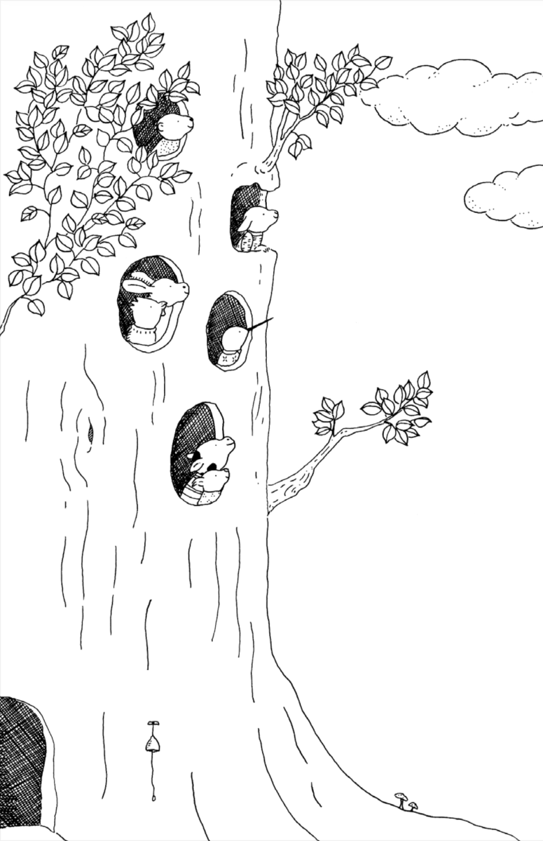 È interessante notare che i bambini sbirciano da ‘buchi nei muri’ per osservare lo strano fenomeno della volpe volante. Buchi? Nei muri della scuola? Saranno stati fatti ad arte per permettere ai bambini di guardare cosa succede fuori? E da che geniale architetto? Forse, l'albero dell'illustrazione di Watanabe? O invece sono buchi che hanno fatto i bambini stessi? Nessuna risposta. Comunque sia, quando la classe è al completo, l'agnello, che è il maestro di scienze: «dice agli alunni di smetterla di sbirciare dai buchi e di stare attenti alla lavagna.» Lo dice proprio come se quei buchi misteriosi fossero del tutto normali. Che siano, dunque, normali finestre? Ma allora perché vengono definiti buchi?