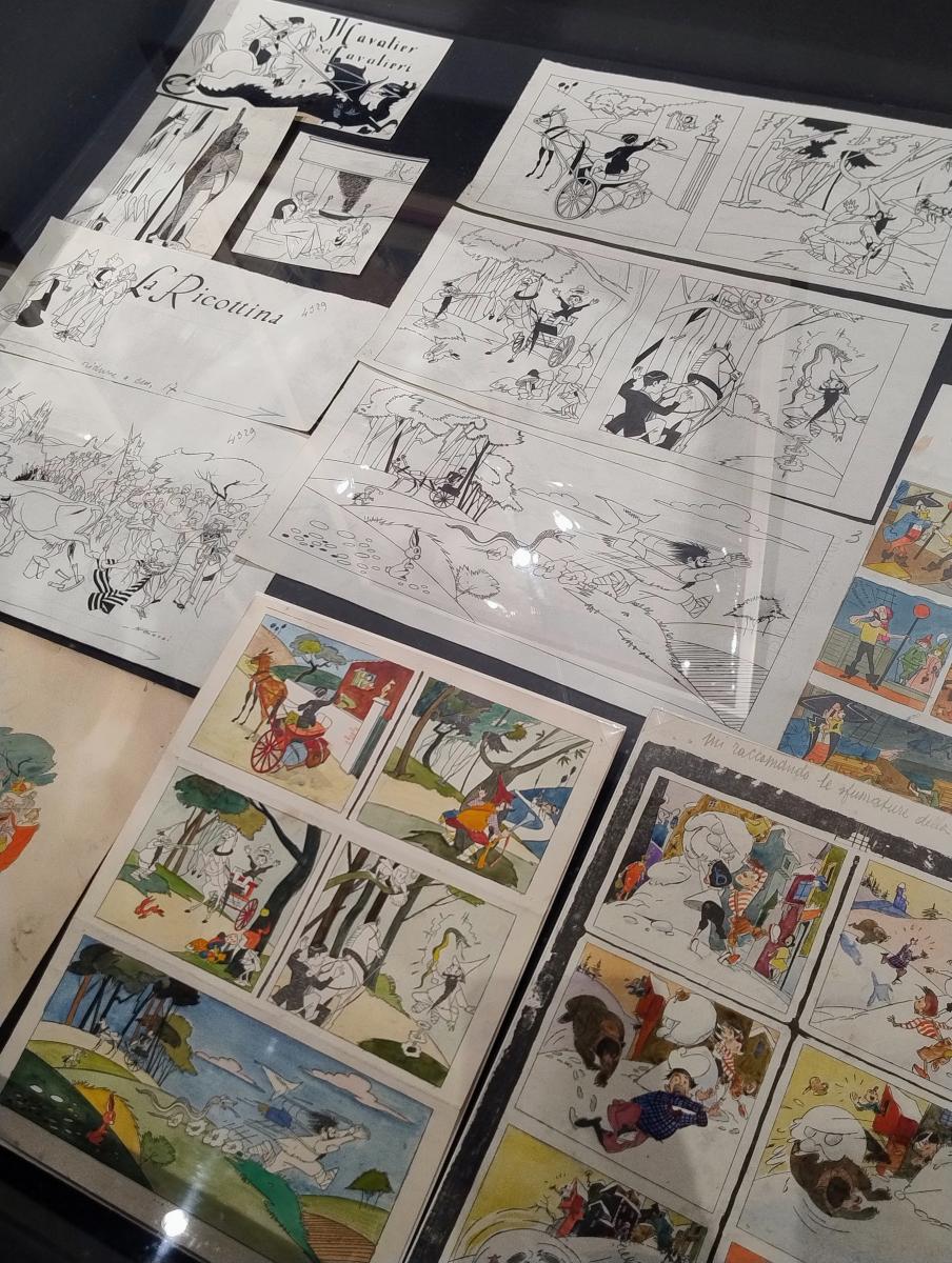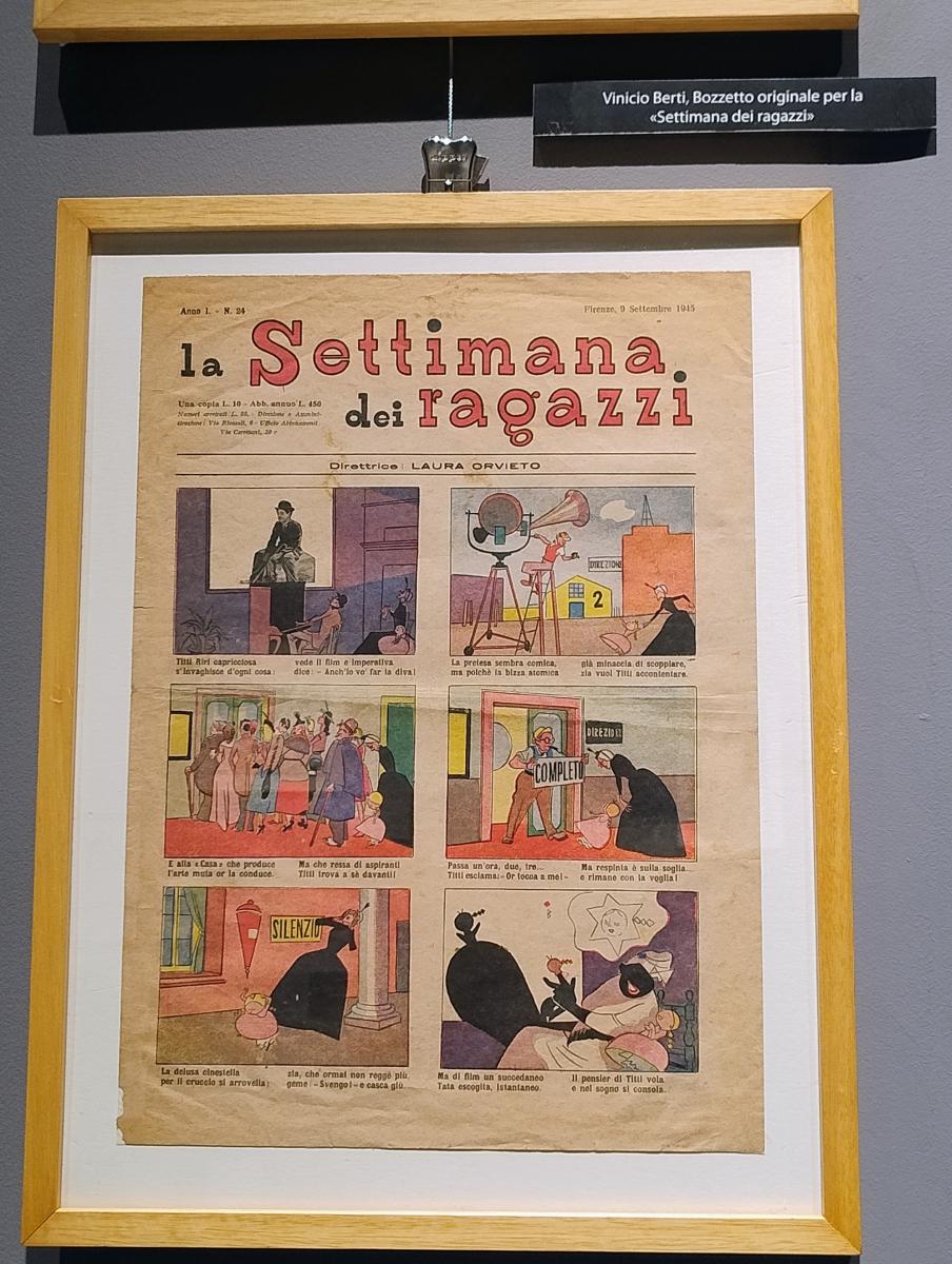 Nel fondo sono conservate anche varie carte relative a La settimana dei ragazzi, rivista illustrata diretta dalla scrittrice dal 1945 al 1947 – in mostra ci sono alcune splendide testimonianze del periodico – assieme (udite, udite!) a lettere e osservazioni dei piccoli lettori e lettrici e a numerosi disegni, bozzetti e prove di stampa per le illustrazioni della rivista. Elisa e Benedetta mi hanno raccontato che le osservazioni dei bambini, che come ben sappiamo sanno essere particolarmente taglienti e a volte lapidari nei loro giudizi, sono molto interessanti, a conferma del fatto che spesso le cosiddette “note a margine” che si trovano sui documenti risultano straordinariamente vitali e significative per la comprensione del documento stesso, indipendentemente dall’età dello scrivente. Naturalmente adesso sono molto curiosa di scoprire cosa hanno scritto i bambini e tornerò presto a farmi viva con le curatrici, ma intanto mi soffermo su un paio di note a margine scritte da adulti e visibili in mostra, come quella dell’illustratore Vinicio Berti a proposito di una tavola “un po’ polemica” de La settimana dei Ragazzi o quella di Fiorenzo Faorzi che si raccomanda di curare le sfumature della neve e del fantoccio in un bozzetto.