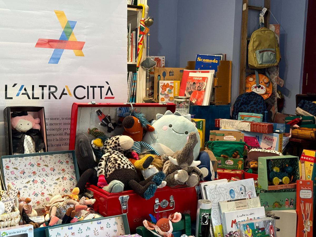 Lo spazio mette insieme in felice mescolanza libri e oggetti per bambini e per adulti, senza barriere. I libri non sono catalogati per generi o temi, ma per categorie che stimolano l’immaginazione e la creazione di mappe di lettura. L’Altracittà è un luogo per perdersi e poi ritrovarsi.