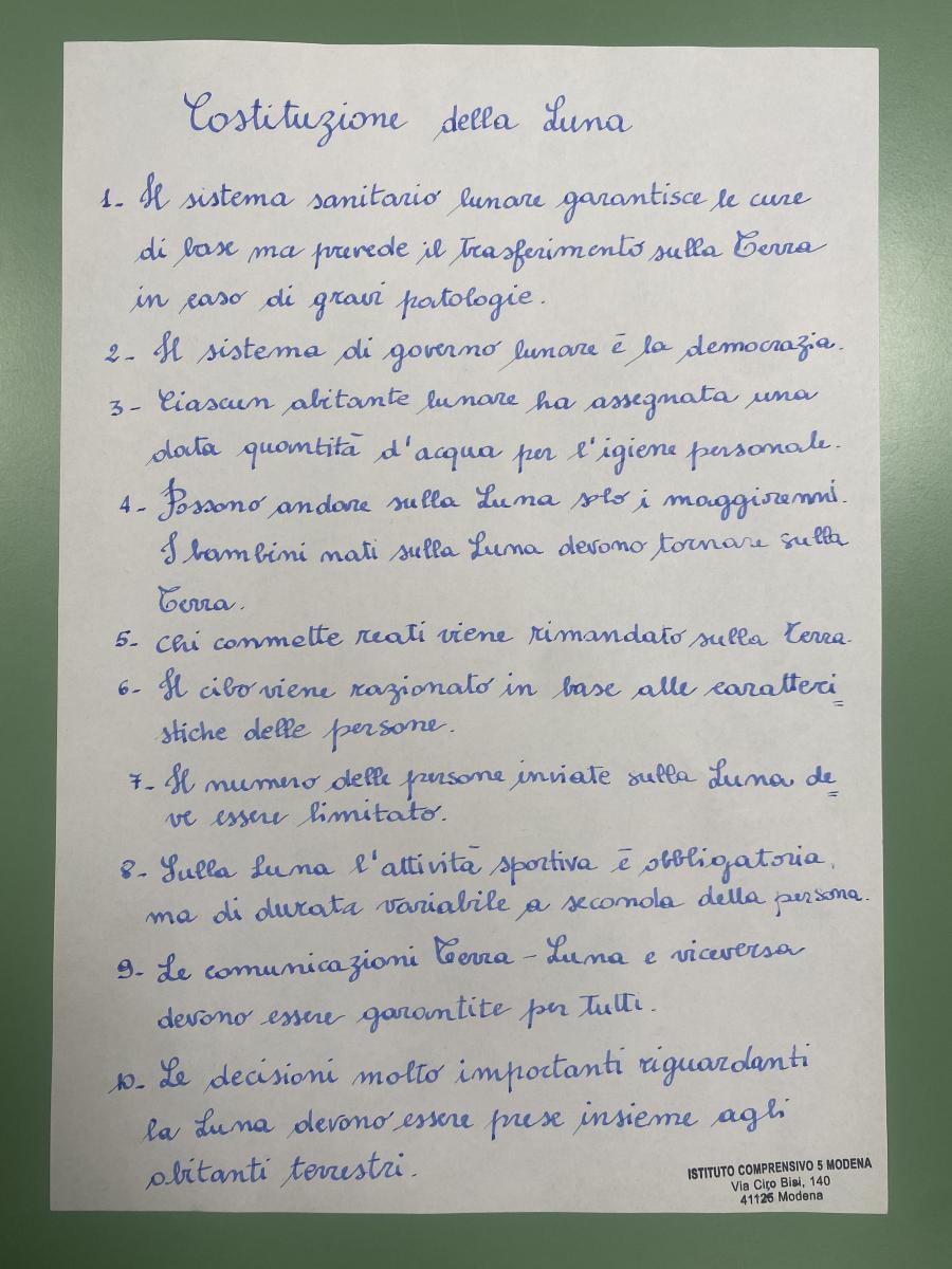Alla fine della discussione, i ragazzi hanno redatto la loro Costituzione della Luna articolata in dieci punti, quelli che hanno ritenuto essere più importanti.