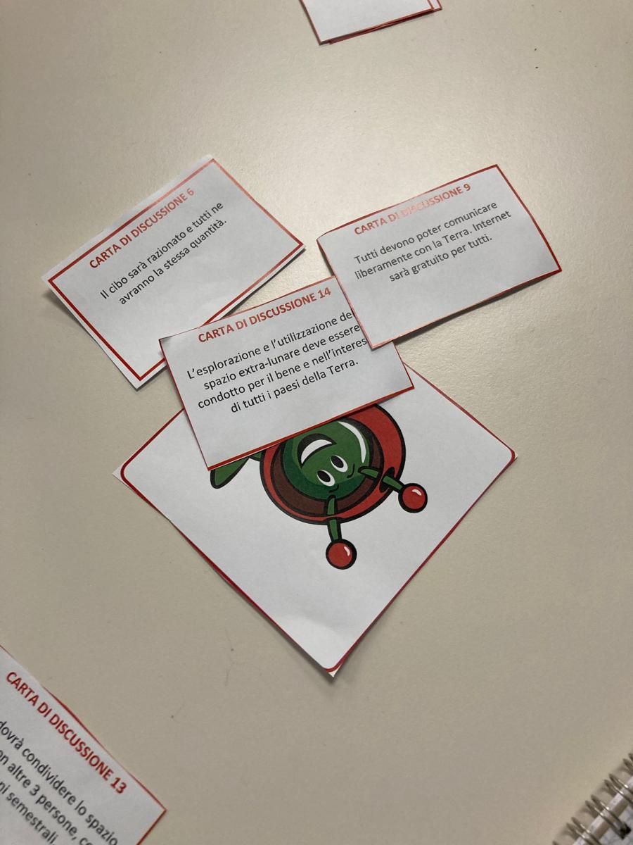 Abbiamo diviso i ragazzi di ogni classe in quattro gruppi e abbiamo fornito loro delle carte su cui sono riportati degli assunti con l’incarico di discutere tra loro e trovare una sintesi su alcuni spunti.