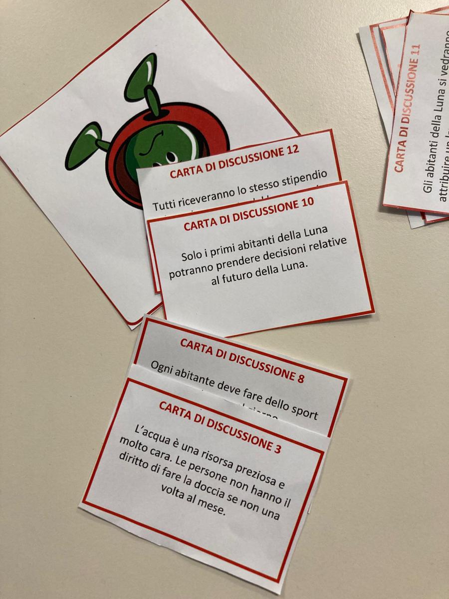 Ad esempio, hanno dovuto pronunciarsi sull’ipotesi che tutti i paesi della Terra abbiano diritto di esprimere pareri sullo sfruttamento lunare o solo quello che ha raggiunto la Luna per primo; se le leggi che sono in vigore sulla Luna debbano essere stabilite dai coloni lunari di concerto con gli abitanti della Terra; come ripartire le risorse disponibili; quali sono le caratteristiche che devono avere i coloni lunari e molte altre. I ragazzi hanno anche preso in considerazione i servizi che utilizzano sulla Terra, come parchi, ospedali, ambulatori, biblioteche, centri sportivi e hanno dibattuto della loro utilità sulla Luna e di come potrebbero essere organizzati e gestiti.