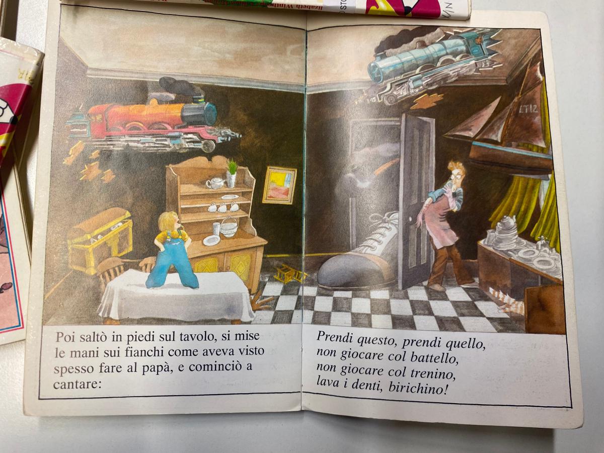 Che strano sentir parlare oggi di un libro come di qualcosa di così pratico. Eppure mi sembra un argomento convincente per un bambino, senza bisogno di blandirlo: la “tascabilità” come vantaggio, e una serie di scenari plausibili sugli usi e consumi di un oggetto di tal fatta.