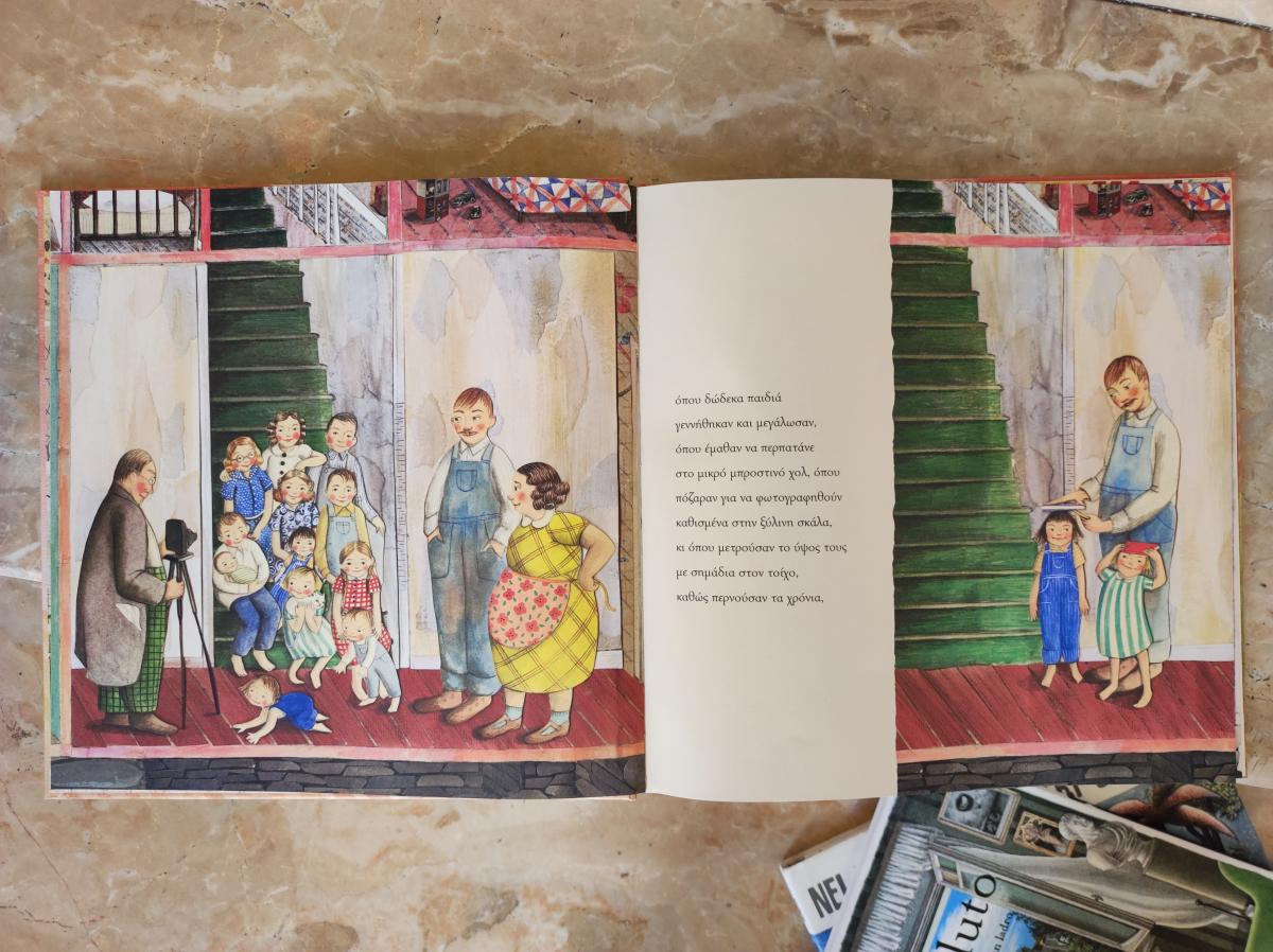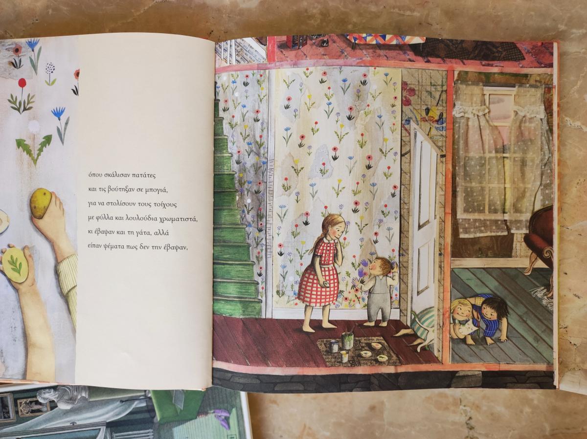 Periferiche e non al centro delle tavole sono anche le scale di legno laccato verde in Canto per una casa ritrovata di Sophie Blackall (Terre di Mezzo, 2023): connettono gli ambienti dell’abitazione, non solo espandendo il punto di vista del lettore, che vede oltre lo spazio in cui sta accadendo il racconto, ma anche caratterizzando l’ampia dimensione ecologica tra cose, persone e luoghi.