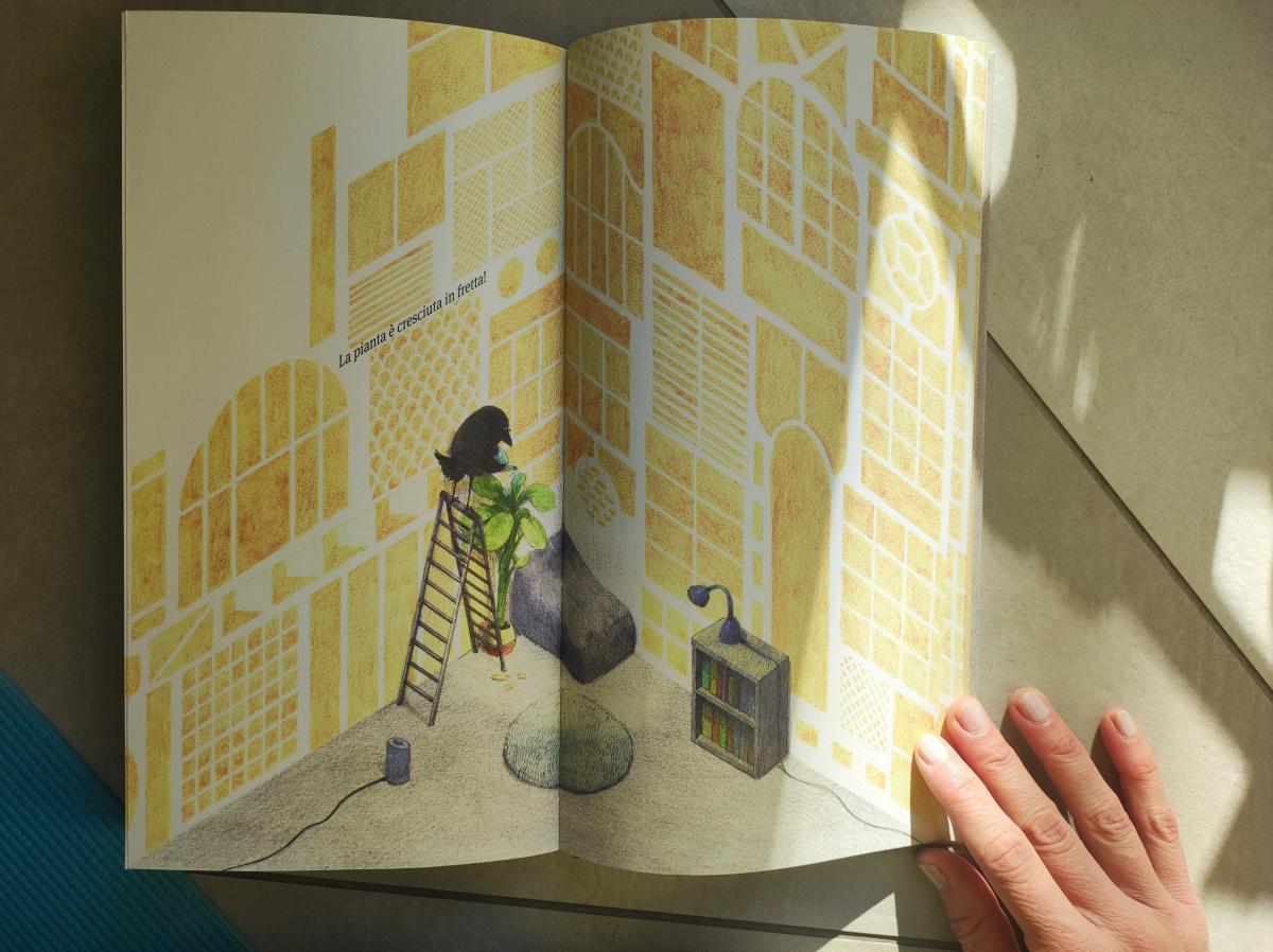 Proseguendo questa ricognizione di scale nell’albo illustrato, vengono alla mente quelle del silent L'angolo (Zo-O, Terre di Mezzo, 2025): inizialmente, al corvo protagonista basta un panchetto per decorare le pareti, poi ha bisogno di una scala allungabile per arrivare fino al soffitto, riproducendo per analogia il processo di crescita di altri elementi nella stanza arredata passo dopo passo dal protagonista, come in una metafora pedagogica dove non c'è vita senza cura.