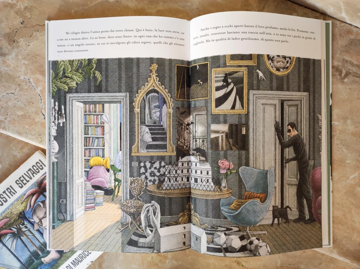 La raffinata scala di casa Snipperpot (Beatrice Alemagna, Il disastrosissimo disastro di Harold Snipperpot, Topipittori, 2018) poco s'addice, se non per contrasto, all'enorme didietro dell'ippopotamo entrato insieme agli altri mammiferi e rettili selvaggi per la grandiosa festa di compleanno del protagonista: l’artificio non riesce a contenere la natura strabordante e la scala è la scena di queste scintille.