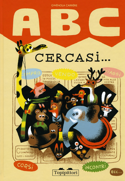 ABC cercasi is a wild alphabet crowded with lively and busy characters. Each letter stands for an animal: Fanny is an ant who works at a paper mill; Gaia is a giraffe ballerina; Hassan is a municipal traffic porcupine; Nikita is a junk-dealer narwhal... Every one of them has a story to tell in an endless ring-around-the-rosies where every one of them is looking for something missing that somebody else does have… A perfect metaphor of alphabet and life: every letter needs the others to become a word. This book is a feast for both the eyes and the hearts.