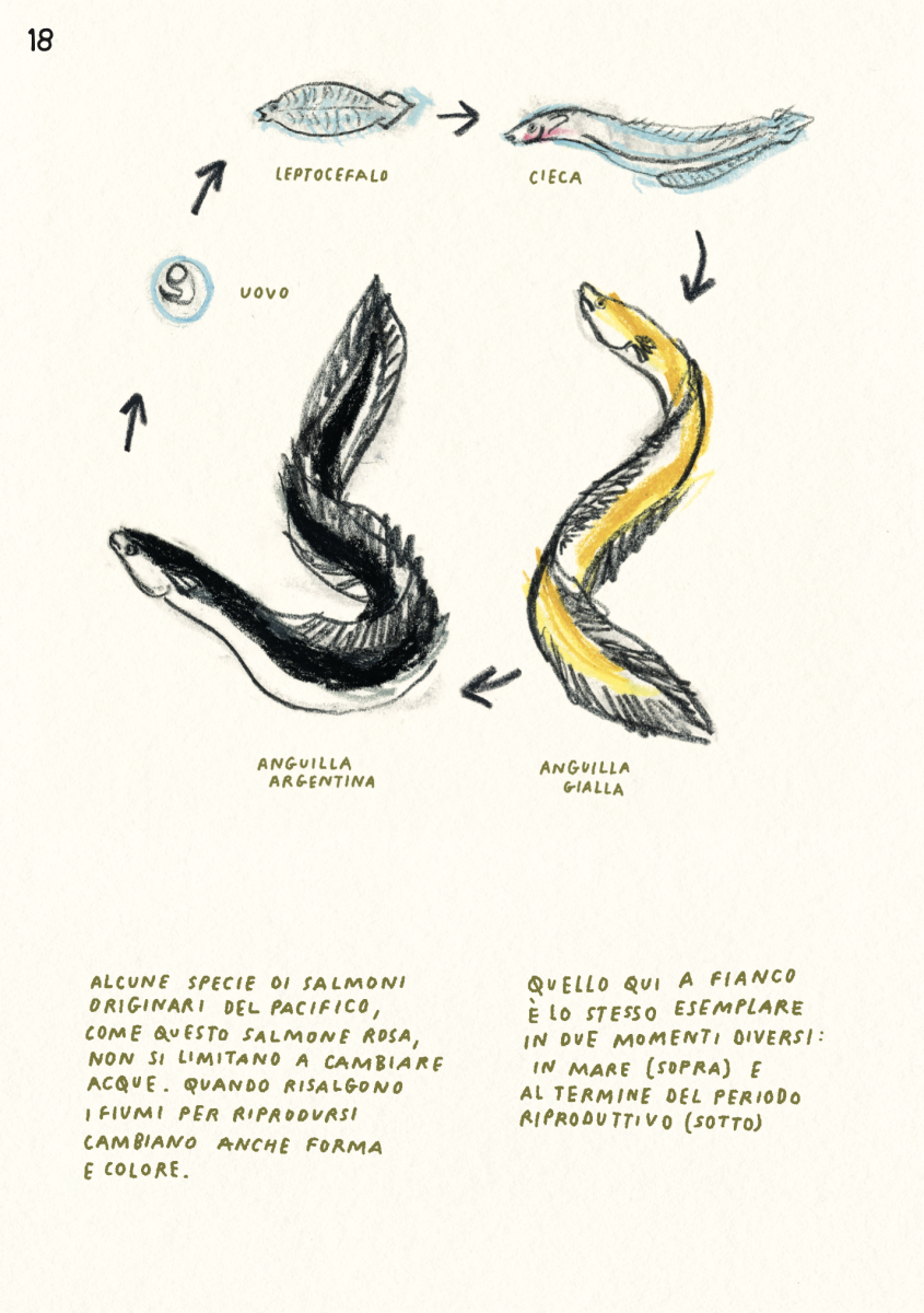 Trasportate dalle correnti, raggiungono le coste europee e solo a questo punto, poco alla volta, si trasformano in grossi e scuri pesci d’acqua dolce.
