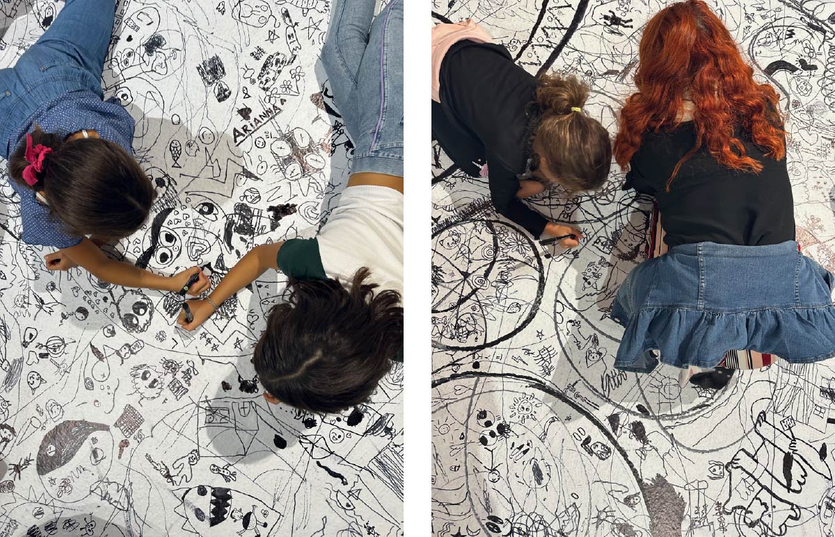 Durante quei primi incontri ci pareva di avere tra le mani una matassa di fili ingarbugliati: sapevamo che ci avrebbero portato da qualche parte, ma prima di tutto bisognava trovare il bandolo e cominciare a dipanare quel gomitolo di possibilità. Sapevamo, però, cosa volevamo. Volevamo che la sala Puà continuasse a essere un unico, grande spazio capace di accogliere tutti. Volevamo che le installazioni al suo interno potessero in qualche modo essere agite. Volevamo parlare del Festival senza essere autoreferenziali. Volevamo, fortissimamente, che proprio nella Sala Puà potessero incontrarsi i nostri due mondi diversi, ma anche vicinissimi, con uno stesso sguardo sulle cose: quello danzato e suonato da Catia, e quello agito dalle mani e dai segni e colori di Elena. Fin qui non avevamo mai avuto modo di intrecciare i nostri percorsi, ma erano anni che pensavamo a quanto sarebbe stato bello incontrarsi davvero. Sì, ma come? Ancora una volta, è stata una foto a innescare i pensieri, guidandoci verso una risposta. Durante la Maratona per un Disegno Infinito del Mondo avevamo notato una mamma e una bambina intente a disegnare sul pavimento un pezzo del loro mondo. I loro corpi sembravano entrare nel disegno. Quei due corpi, così fisicamente intrecciati al groviglio di pennarelli del fondo, ci hanno convinte che proprio il corpo avrebbe dovuto essere centrale.