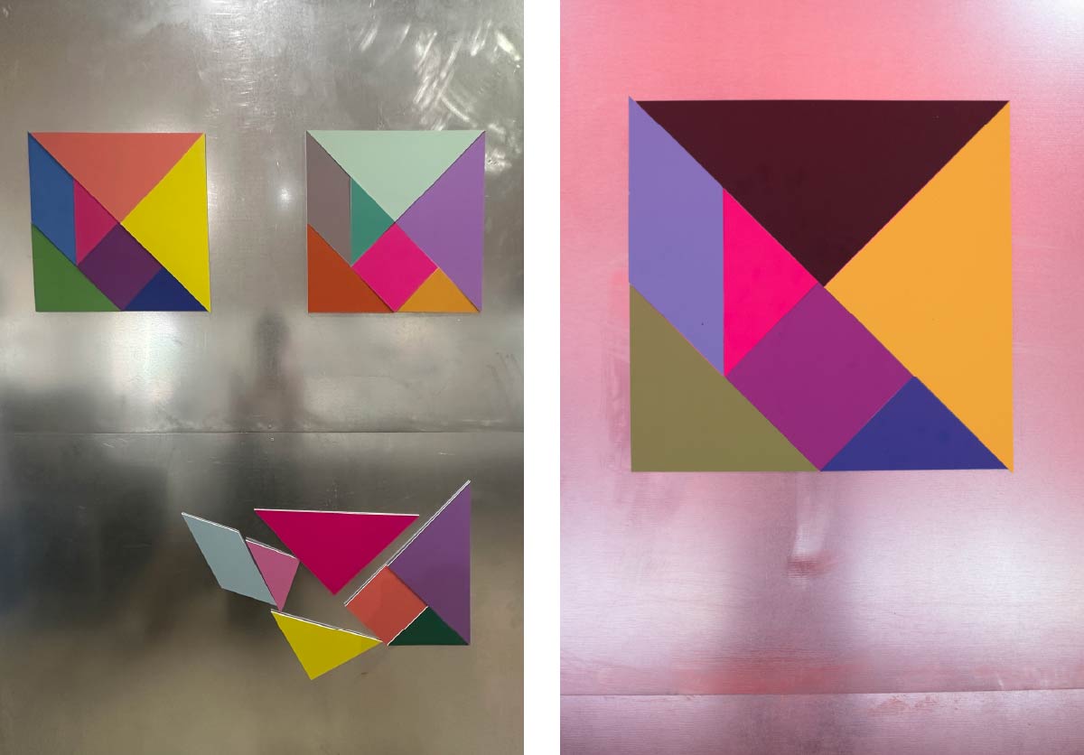 Perché il colore, come scriveva Josef Albers, altro straordinario insegnante del Bauhaus, inganna di continuo. Non lo puoi fissare, non lo puoi, neppure, esattamente definire. Costruire un inventario dei colori può essere l’occasione per aprire le porte alle infinite combinazioni e le molteplici possibilità che ogni colore porta con sé. Lo spazio chiuso dalle volte della sala Puà stava diventando, in quelle prime chiacchierate ancora confuse, il luogo dove fare esperienza del colore. Ecco allora che le pareti metalliche recuperate da un vecchio allestimento (perché noi del Tuttestorie non buttiamo mai via nulla) diventano la tavola su cui scomporre e ricomporre giganteschi tangram magnetici.