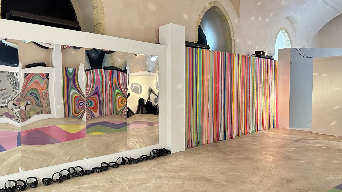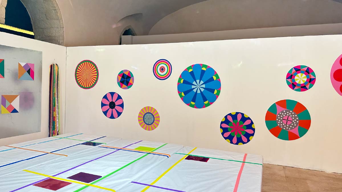 E allora, proprio accanto ai grandi cerchi sempre in movimento, per continuare questo dialogo tra colore e spazio, un fascio di nastri variopinti.