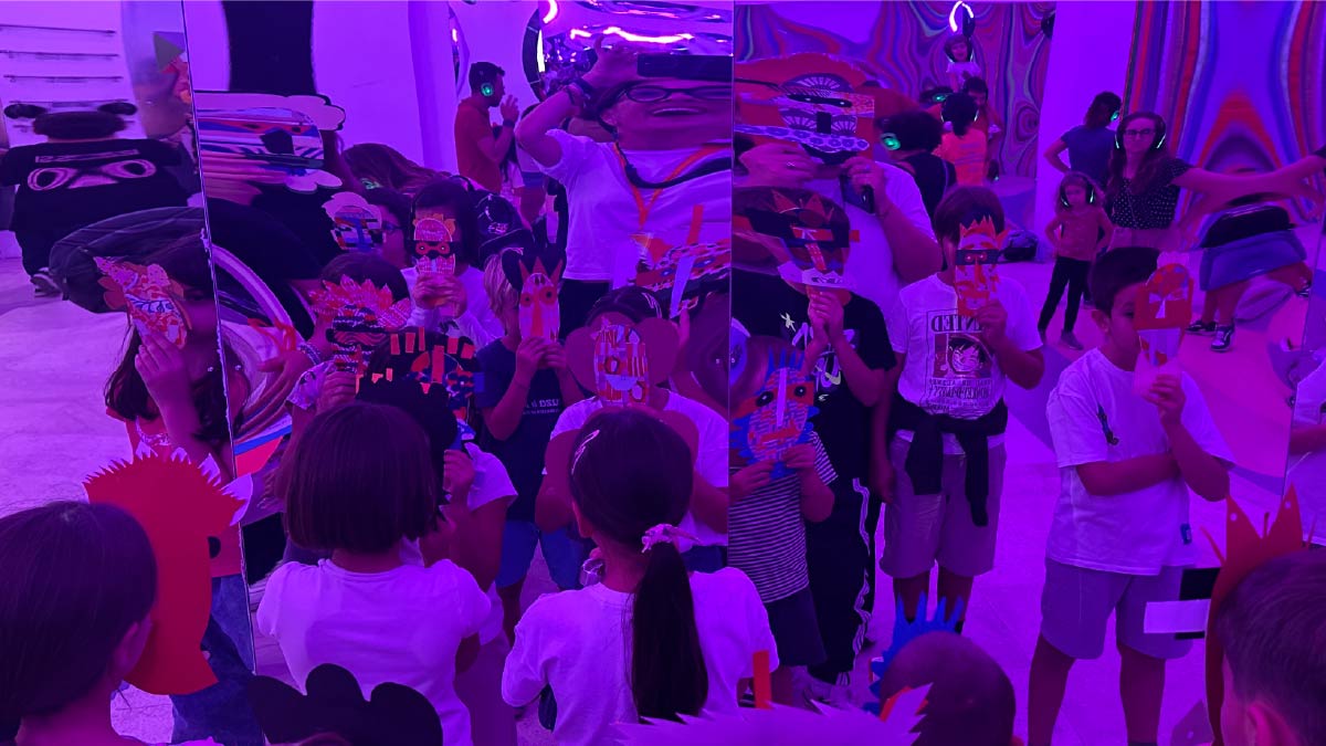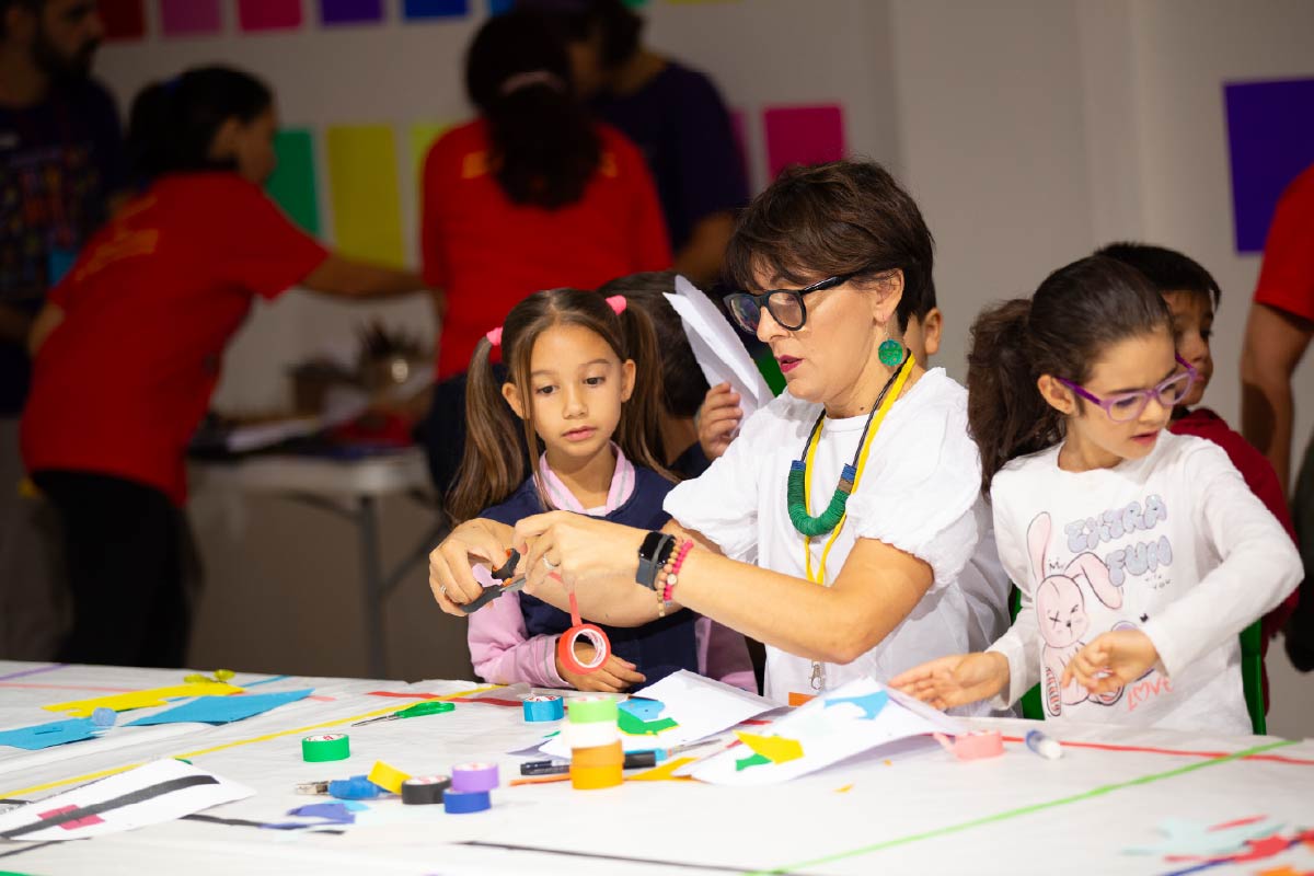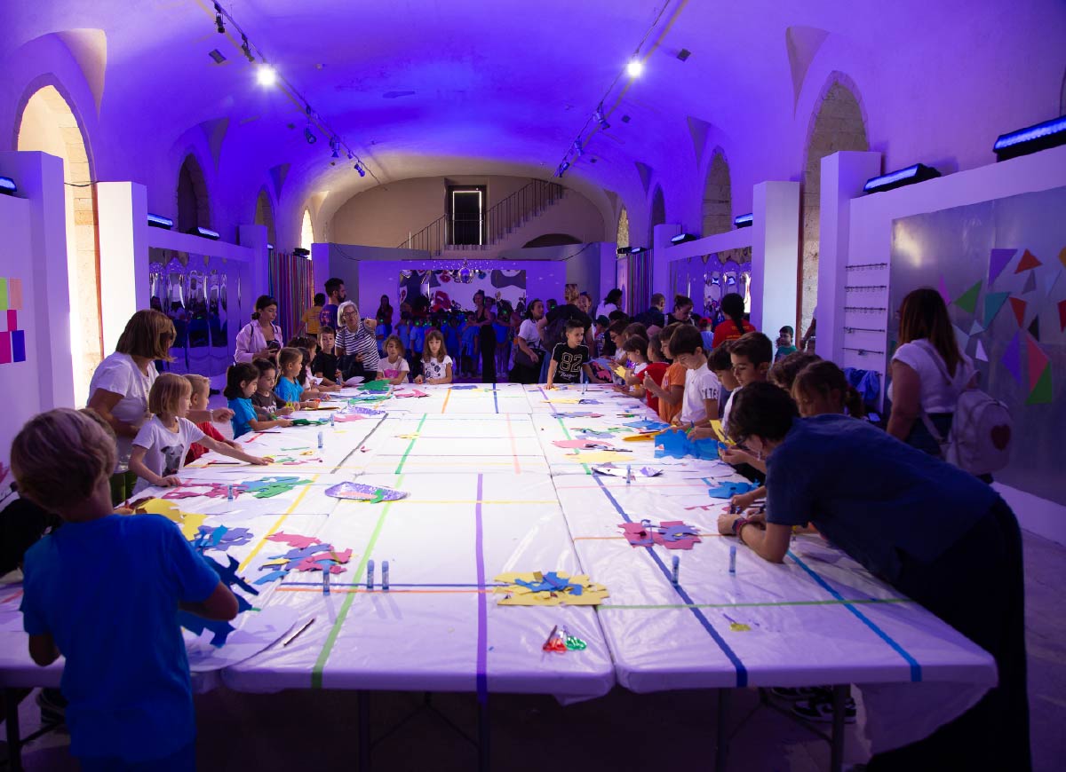 Sui grandi tavoli disegnati con nastri di scotch colorato, Elena, assistita da un nutrito gruppo di insostituibili volontari, per tutta la durata del Festival, ha aiutato i bambini e le bambine a costruire maschere di carta capaci di catturare pennellate di luce e enfatizzare il movimento dei corpi.