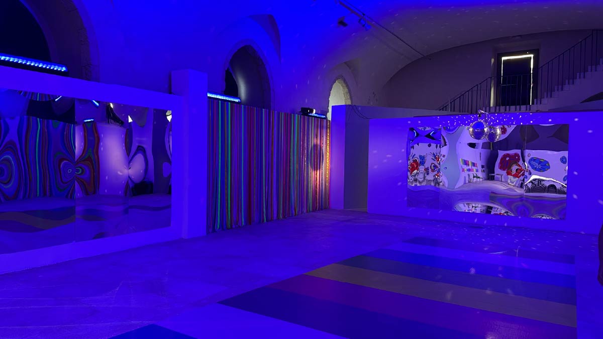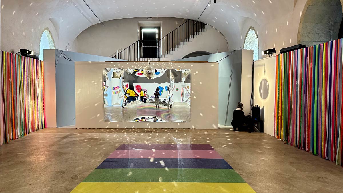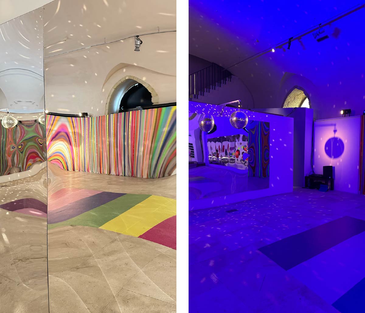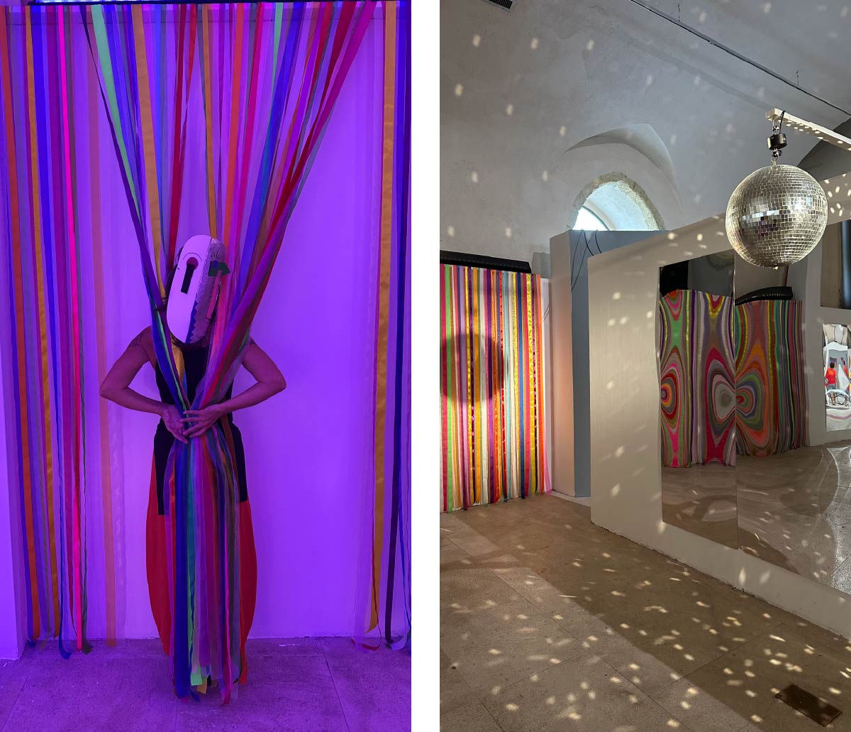 Per passare da qui a lì un ponte-xilofono colorato da suonare -idealmente- con i piedi. Alle pareti una foresta di nastri colorati in cui entrare ed uscire, nascondersi e riemergere. E una palla strobo, a proiettare attorno scintille luminose.