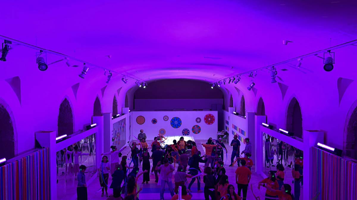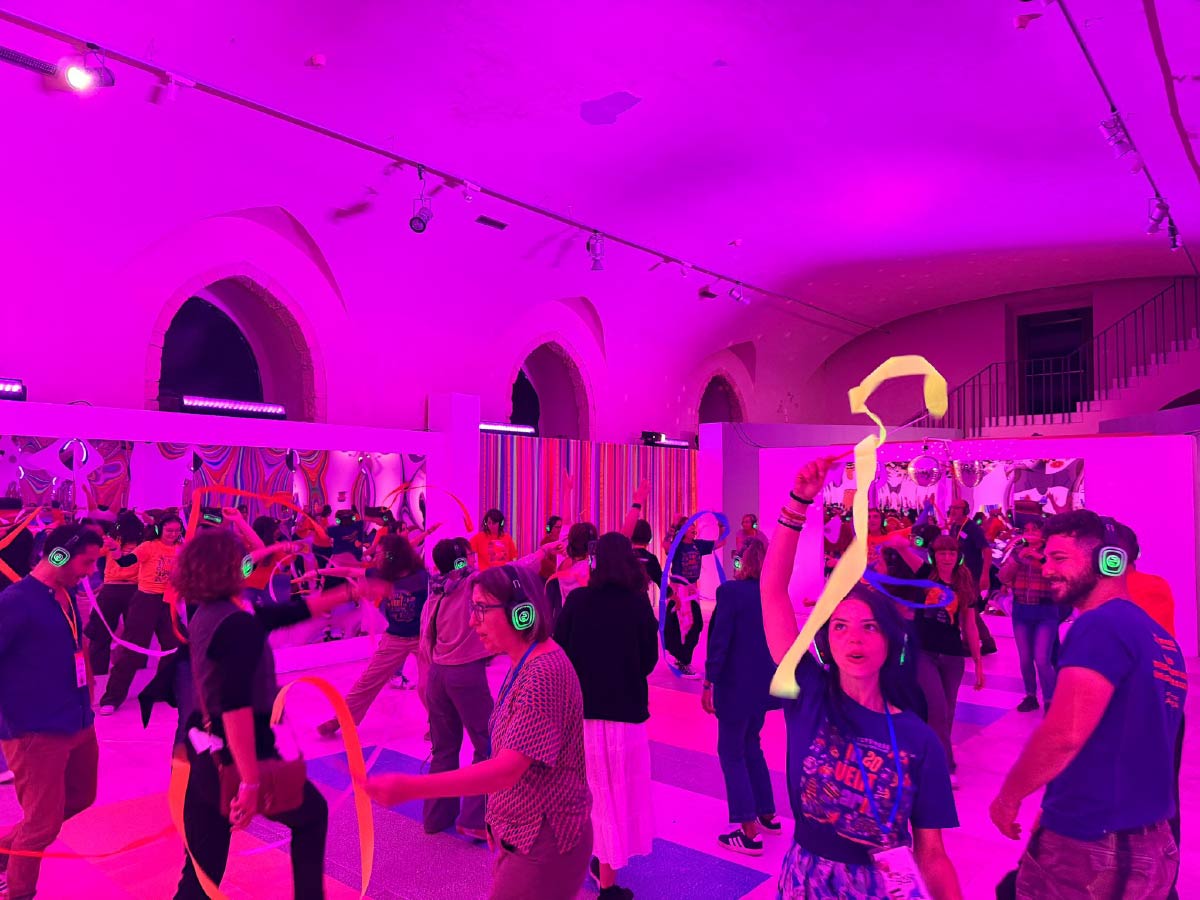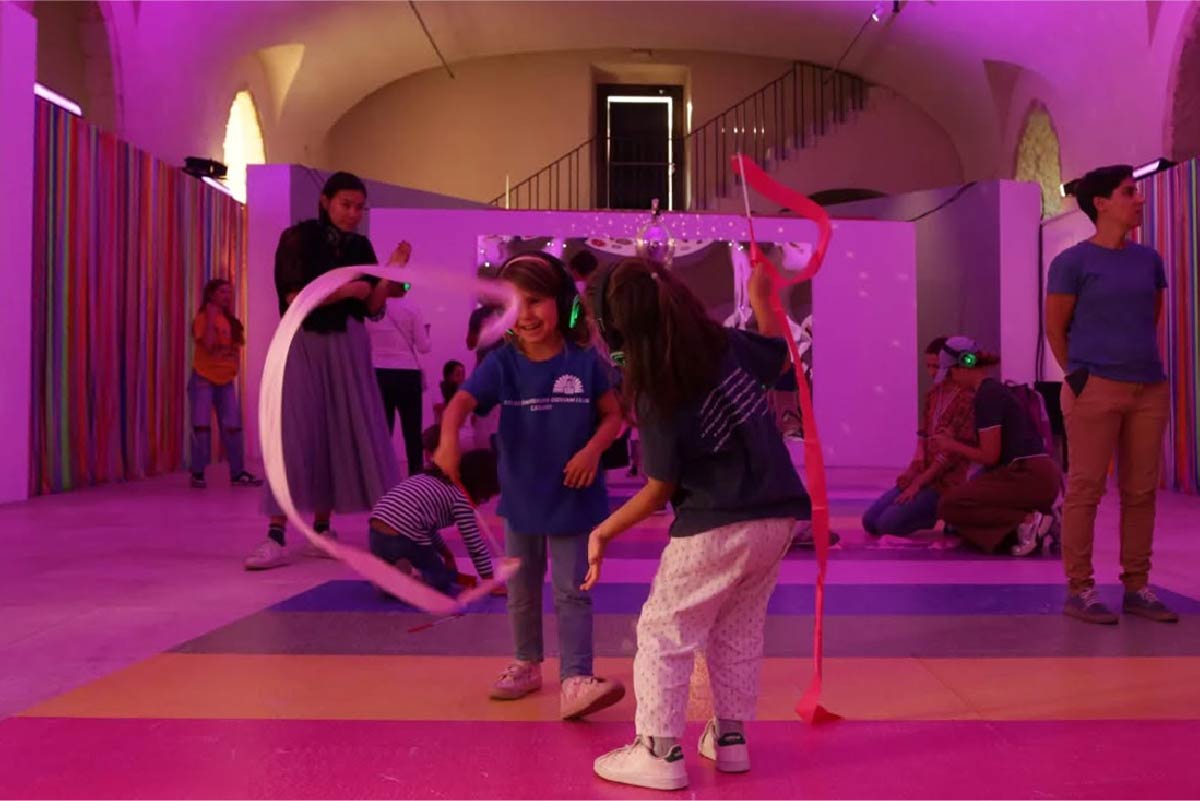 La voce invita i partecipanti a utilizzare il linguaggio del corpo per incarnare le sfumature e le qualità del colore in un’esperienza di sinestesia tra movimento, musica e percezione cromatica. In cuffia, viene suggerito di trasformarsi in altro, muovendosi su una colonna sonora dinamica, giocata su cambi di intensità, aumento del volume e stratificazione degli strumenti. È un’esperienza immersiva da cui si esce conservando una vera e propria memoria muscolare del colore.