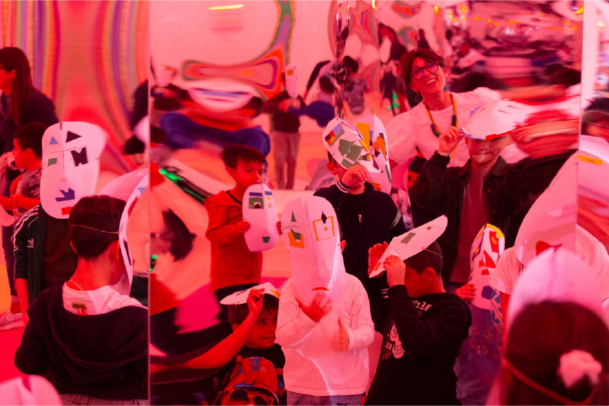 Le maschere realizzate nel velocissimo laboratorio con ritagli colorati, prendono vita diventando estensioni del corpo, indossate come cappellini o brandite come scudi.