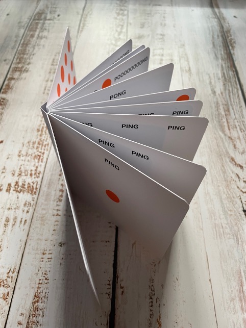 Nella pagina successiva i cerchi sono due, così come i suoni che li accompagnano, Ping Ping, e sono disposti in fila nel centro della pagina; girando la pagina vediamo una diagonale, con tre cerchi arancioni, che diventano quattro, poi cinque fino a moltiplicarsi e rimbalzare nella pagina, dando vita a figure geometriche sempre più complesse. I cerchi potrebbero essere palline, anche perché sono accompagnate da Ping, da Pong, o da altri suoni onomatopeici che fanno subito pensare a una pallina che rimbalza. Ping Pong è una storia di forme e numeri che danzano attraverso la ripetizione di suoni capaci di dare ritmo alla narrazione.