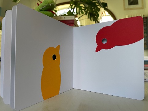 I buchi attirano lo sguardo: ci si può guardare attraverso, ma anche essere guardati; dai buchi, inoltre, con le piccole dita si possono afferrare le pagine e possiamo cambiarne l’orientamento, così da osservare la storia da angolazioni differenti.
