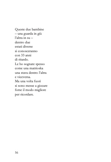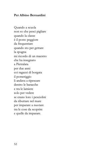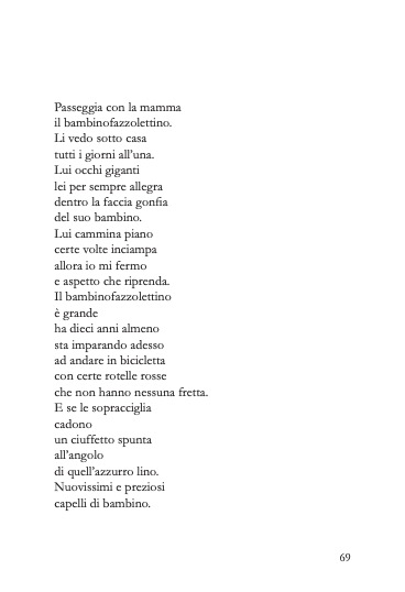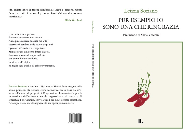 «Nel libro di Letizia Soriano (insegnante, appassionata di pedagogia, ricercatrice di storie che raccontano la scuola, interessata da sempre all’intercultura, formatrice, sia in Italia sia all’estero, all’interno di progetti di Cooperazione Internazionale per la promozione dell’inclusione sociale) si sente l’odore dell’infanzia, la propria e quello delle altre infanzie che l’autrice incontra. Tove Ditlevsen, in un altro passaggio del suo meraviglioso libro, scriveva anche “l’infanzia è lunga e stretta come una bara, e non si può uscirne da soli” ecco che se torno su questo passaggio leggo meglio le incursioni dei bambini nei versi di Letizia.»