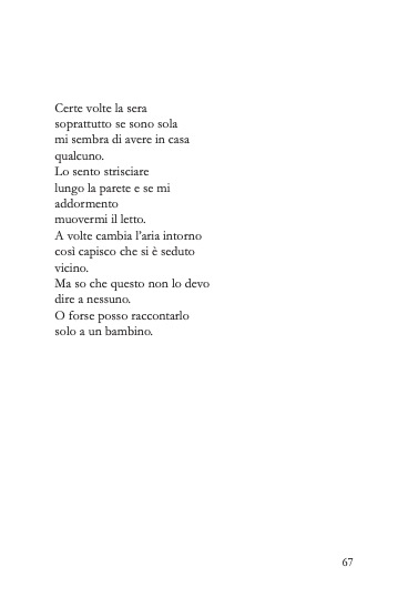 In questi tuoi versi, infine, trovo un’attitudine simile a quella della fiaba, quella di volgere il piombo in oro: ovvero dalla narrazione di una condizione di partenza cupa, minacciosa, disagevole, a quella di una fine dove si trova una possibile giustizia, un riscatto, la scoperta di un luogo abitabile e (abbastanza) sicuro, si recupera senso e respiro. E anche questa è una cosa mi fa pensare molto all’infanzia e al suo modo di guardare alle cose.