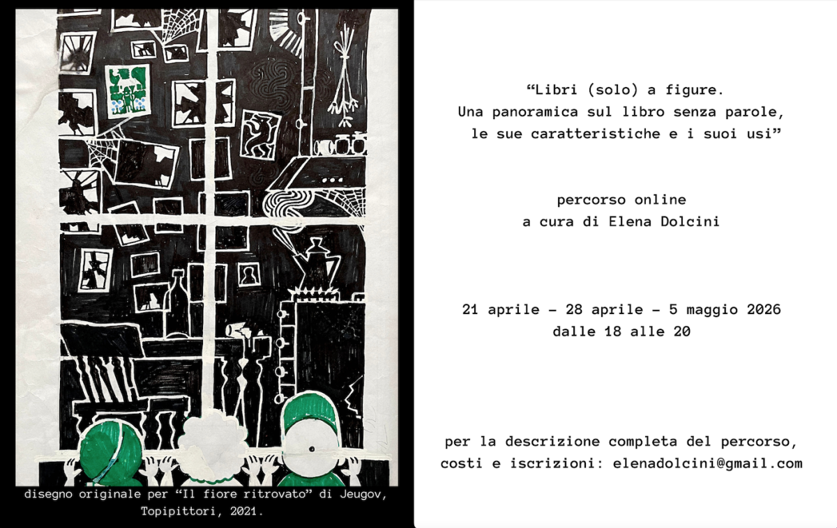 Questo percorso online, che consta di tre appuntamenti (21 aprile, 28 aprile e 5 maggio, dalle 18 alle 20), nasce e si sviluppa a partire dai quesiti che hanno animato e animano le conversazioni intrattenute negli anni con insegnanti e appassionati del libro a figure. Anche dopo aver imparato a conoscerlo, il libro senza parole rimane oggetto di grande curiosità, probabilmente perché è assimilabile a un’opera d’arte con caratteristiche uniche nel panorama editoriale e il suo dispiegarsi narrativo, senza l’elemento che la nostra cultura associa per antonomasia al racconto, desta meraviglia.