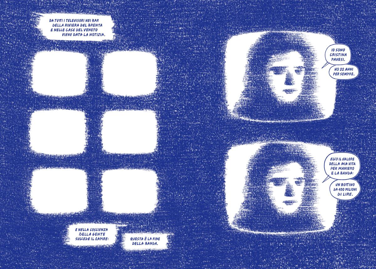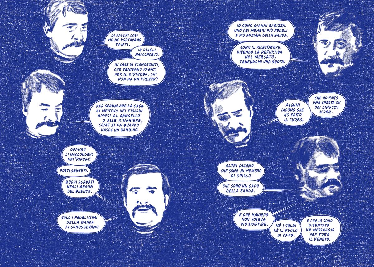 La storia non è quella di Felice Maniero: per noi e per la casa editrice era importante che questa non fosse la sua biografia. Quando si lavora con le immagini, il rischio di estetizzare è alto. Un volto in copertina in qualche modo celebra e, celebrando, legittima. E anche un atto criminale, per quanto brutale sia, indorato da una narrazione e dei disegni ben fatti, può diventare digeribile, avvincente.