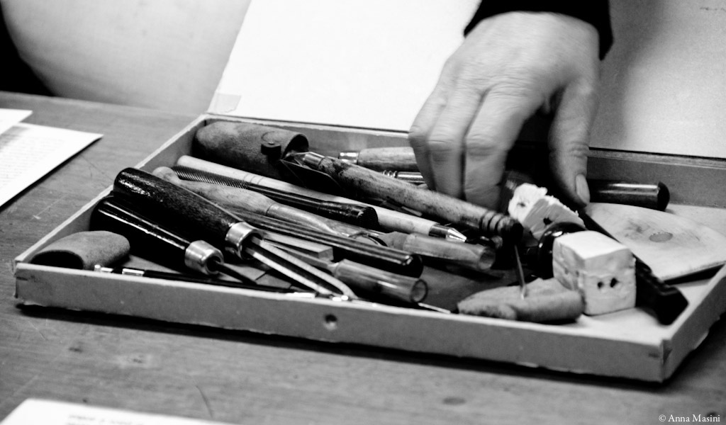 Aun certo punto ci avviciniamo al tavolo da lavoro e al torchio: lemani di Florence ci mostrano come ottenere stampe con le tecnichedi cui ci ha parlato poco prima.