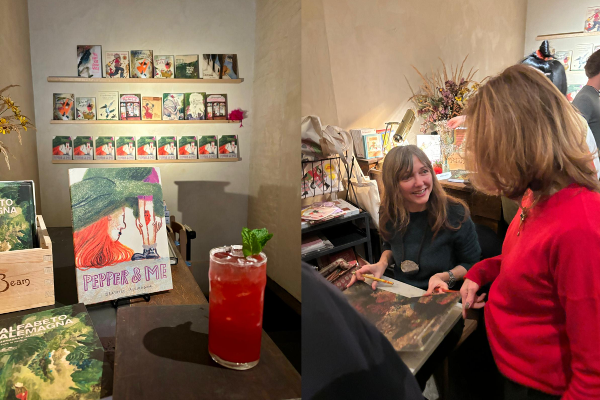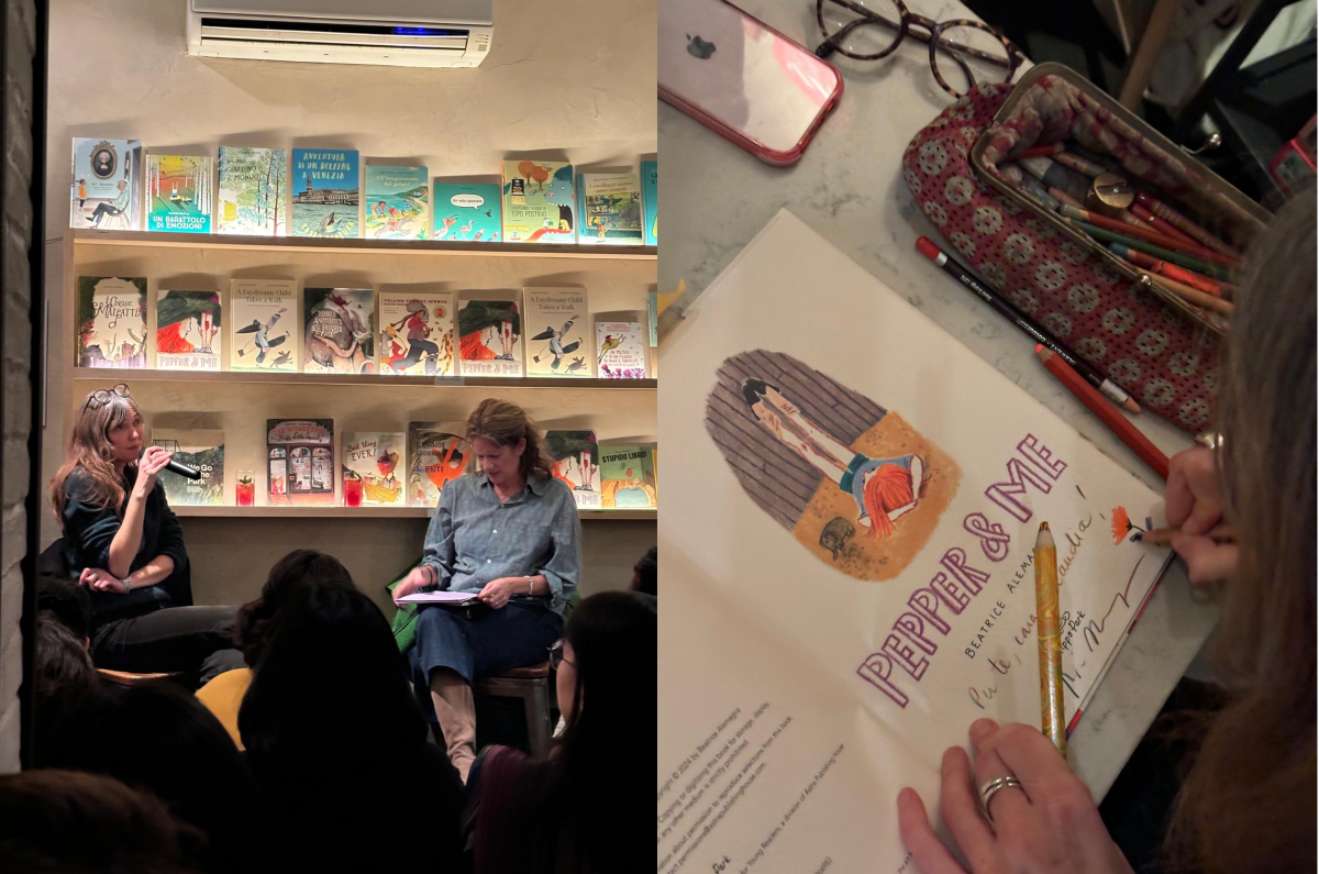Beatrice è molto amata qui, ha toccato il cuore di molti lettori ed è stimata da un pubblico adulto di creativi, architetti, designer, artisti. La sua presentazione è stata un successo e i suoi libri sono sempre presenti da noi, in italiano e in inglese. L’anno scorso, Io e Pepper è stato premiato con la medaglia d’oro dalla prestigiosa Society of Illustrators e la sua editrice ci ha subito proposto un evento qui a SULLALUNA NY per festeggiare Beatrice e ospitarla in una libreria italiana.