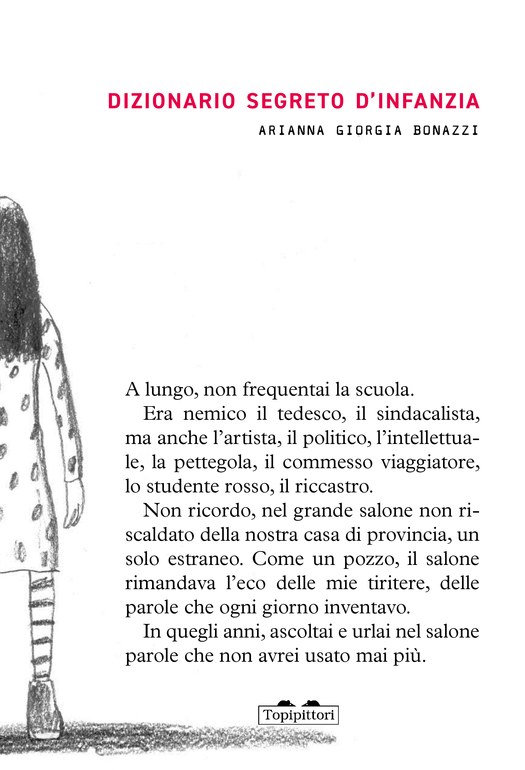 Nel corso della mia infanzia, ho avuto la sensazione che le parole, sebbene usate anche da altri, fossero solo mie, e che servissero a delineare il mio mondo. Arianna Giorgia Bonazzi, scrittrice, traduttrice e giornalista, per la prima volta in catalogo, racconta un’infanzia incentrata sulla parola, in quanto, soprattutto, suono e forma. Parole inventate, trasfigurate, piene di dolore, ruvide, rabbiose in cui il significante si fa significato per costruire un linguaggio intimo e personalissimo che aiuta a resistere all’incomprensione del mondo adulto. Dizionario segreto d’infanzia si inserisce perfettamente nella collana ‘I topi immaginari’, che accoglie racconti brevi, talvolta brevissimi, episodi, ricordi, visioni, letture e incontri fondamentali per la costruzione del proprio immaginario e la formazione di sé.