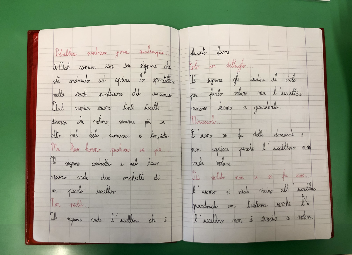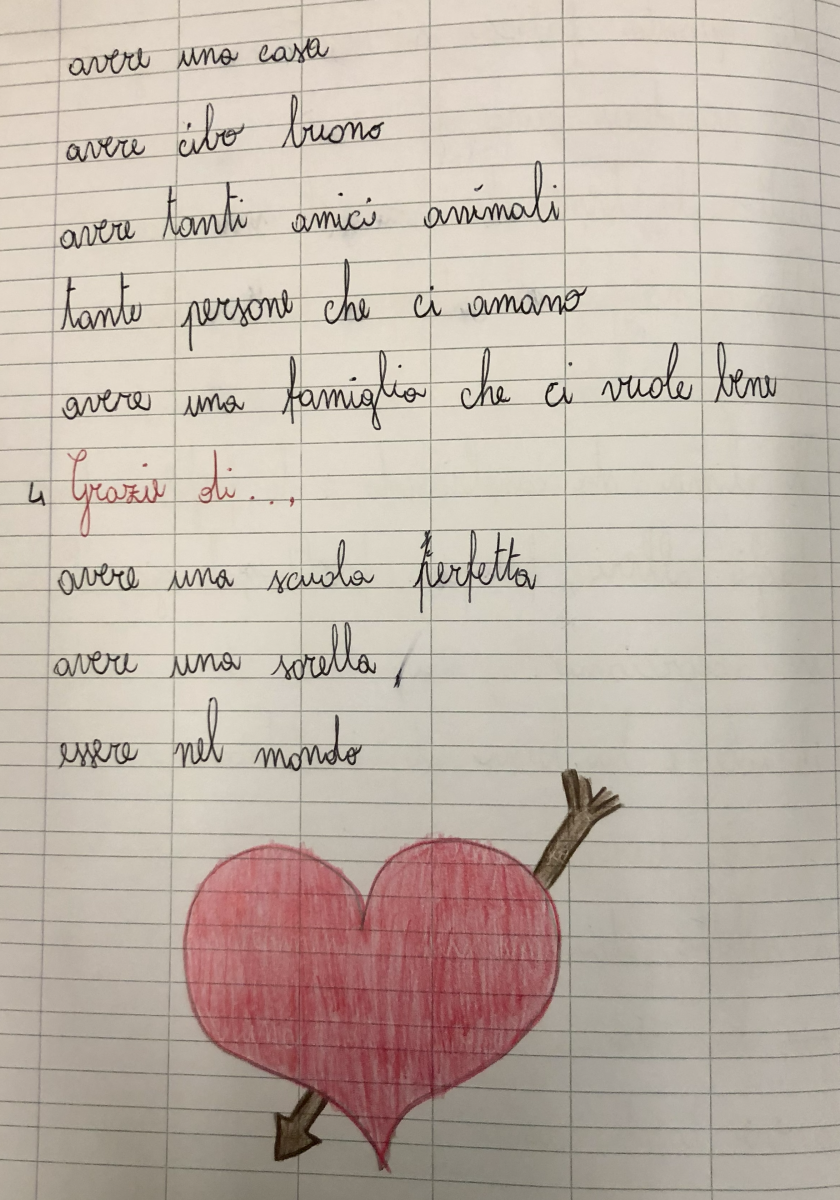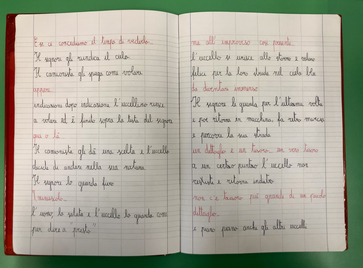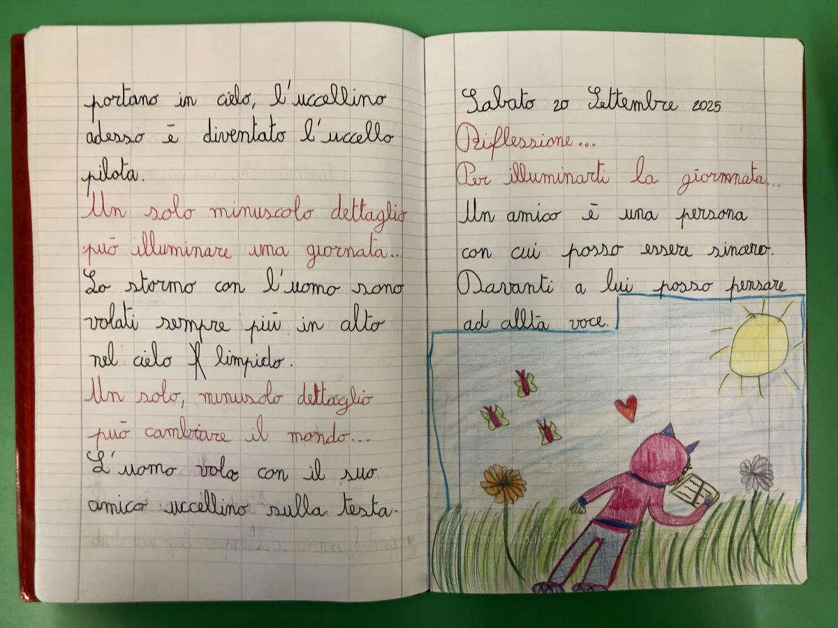 Grazie per la mia scuola, grazie per i miei amici, grazie per la mia famiglia. Di fronte ai quaderni dei suoi alunni, Alessandra, l’insegnante, ha commentato che questo lavoro è diventato “una dichiarazione d’amore alla vita”. E in effetti, nel percorso di lettura e scrittura di Gli uccelli, i bambini hanno imparato che anche i dettagli più piccoli – un gesto gentile, una parola, un atto di gratitudine – possono davvero cambiare il nostro modo di stare dentro le cose.