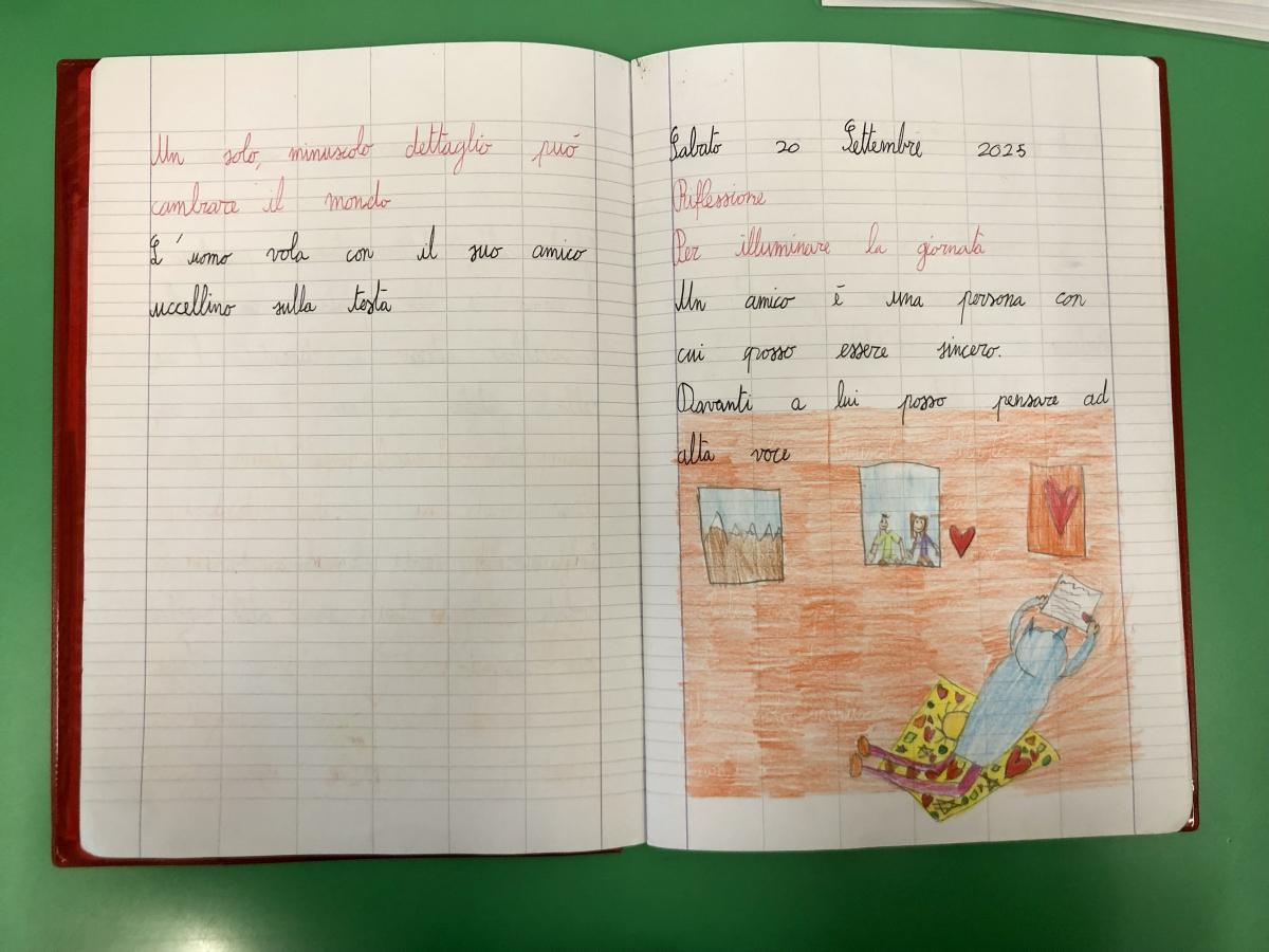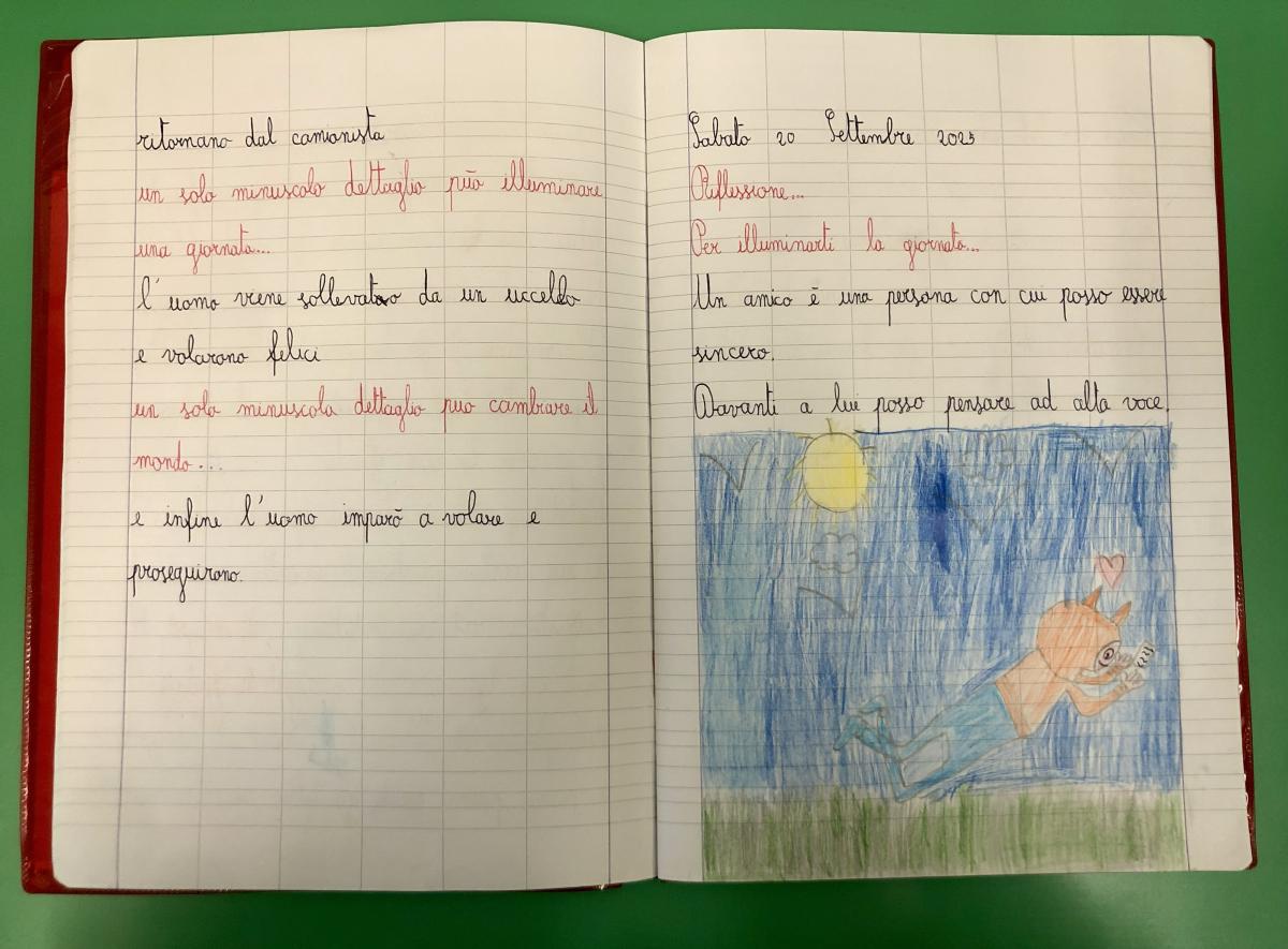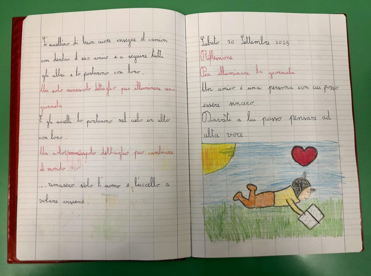 Quest’anno, quel seme, ha preso una forma diversa. Il 17 settembre, sotto le fronde di un albero del giardino, i bambini della classe quarta hanno trovato appesi ai rami i loro “diari della gratitudine”, pronti ad accogliere pensieri, scoperte e piccoli gesti quotidiani. Da quel momento è iniziato un percorso di scrittura e riflessione guidato dall’insegnante Alessandra Ronci, che da anni porta avanti un metodo basato sulla libertà espressiva e sull’educazione alla parola come strumento di conoscenza.
