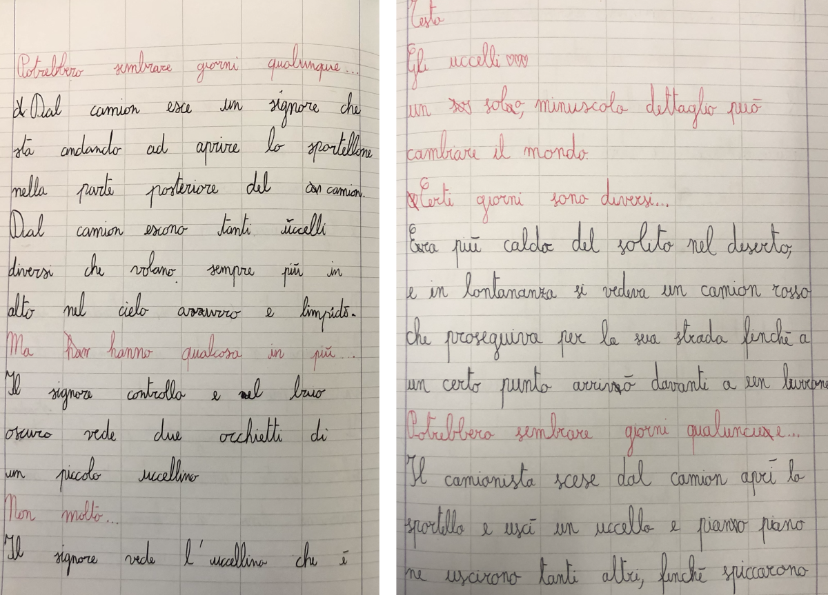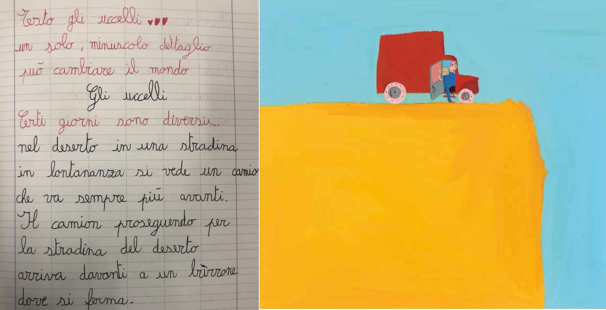 Da queste osservazioni è nata un’attività di scrittura dedicata agli incipit, i momenti di inizio, le frasi che accendono una storia. Gli incipit del libro sono diventati scintille per nuove narrazioni. I bambini, lavorando prima collettivamente e poi in coppia, hanno immaginato e costruito storie partendo da un’unica frase: “Potrebbero sembrare giorni qualunque…”. Da lì sono nate storie dentro la storia: un camion rosso che attraversa il deserto, un uccello che vola libero nel cielo, un uomo che scopre due occhi nascosti tra le nuvole. Le coppie di scrittura, scelte con attenzione per favorire l’ascolto reciproco, hanno permesso ai bambini di conoscersi meglio, di mescolare le proprie voci, di imparare che scrivere insieme è anche un modo per costruire un legame.