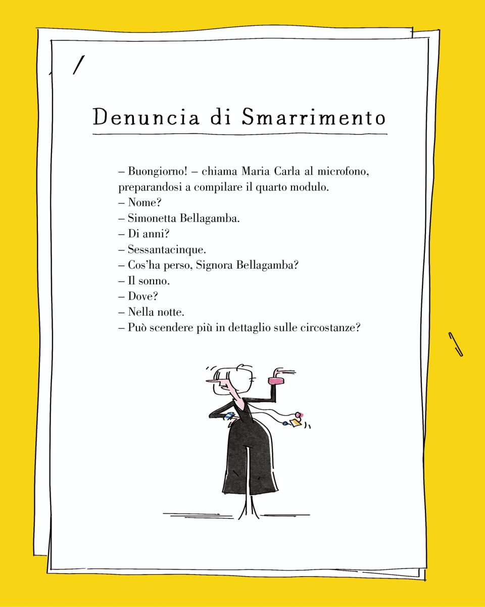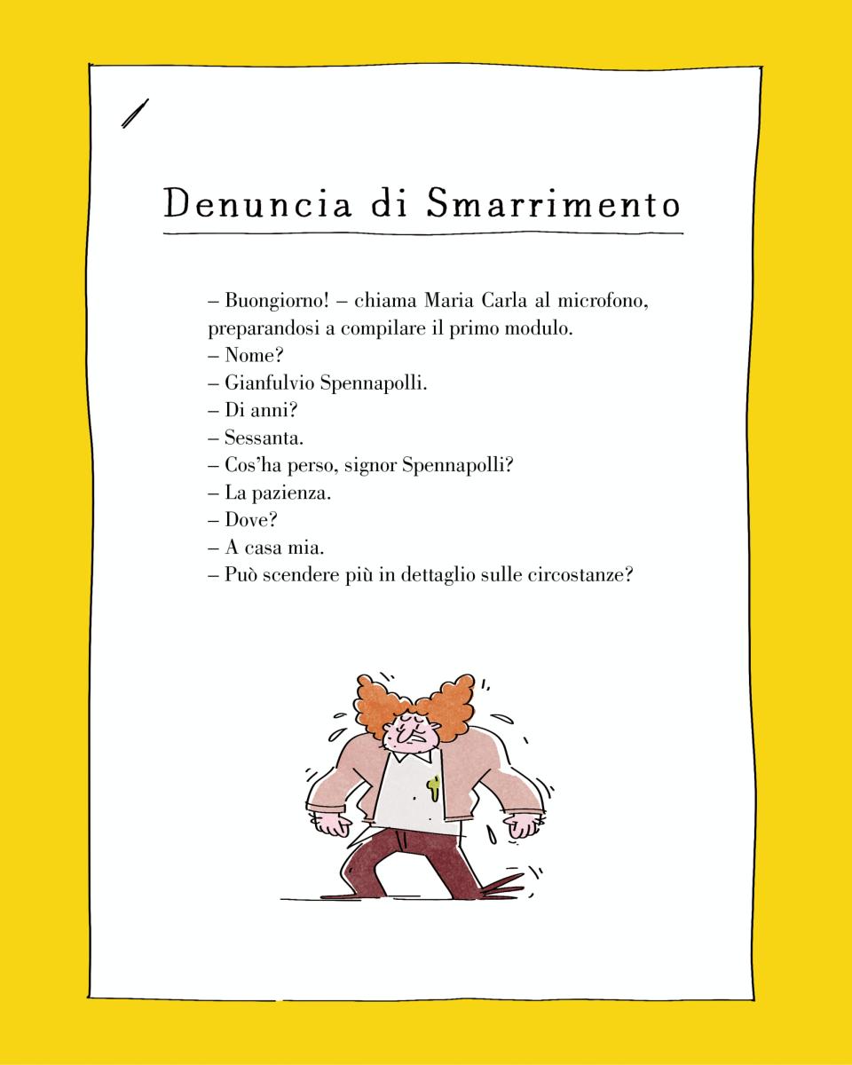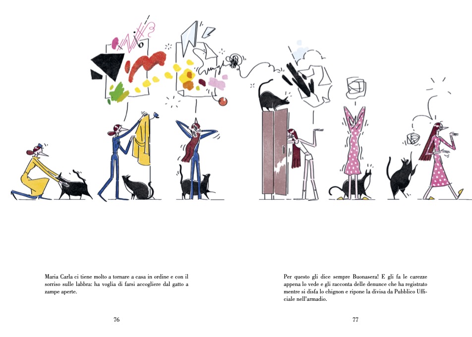 La bella notizia è che anche Maria Carla e il suo gatto hanno preso forma e colore. La Maria Carla di Lorenza maneggia con disinvoltura la linea tratteggiata su cui apporre la firma del modulo di smarrimento e, nella sua impeccabile uniforme blu, è a disposizione di chiunque sia alla ricerca di un oggetto smarrito… o di se stesso.