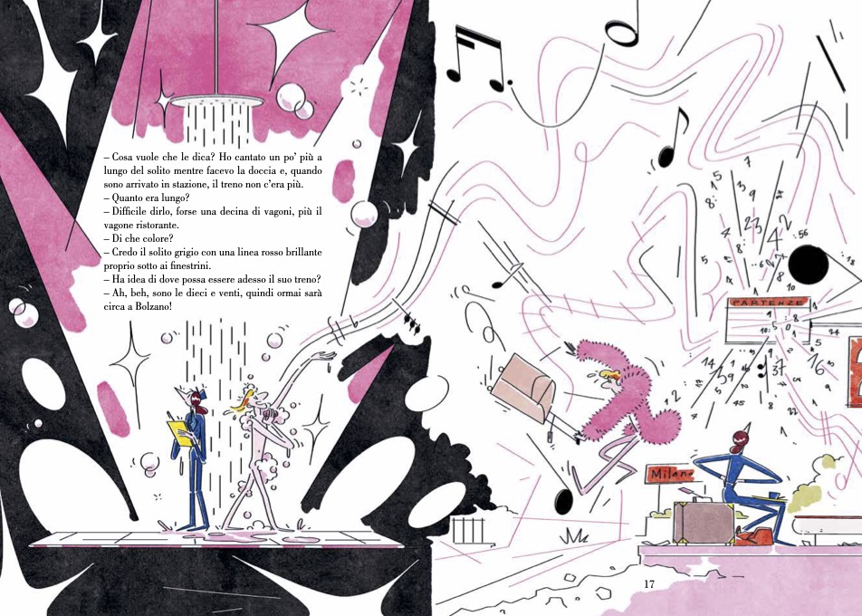 L’eccezionalità delle situazioni e dei personaggi è stata rappresentata perfettamente dal segno ironico ed elegante di Lorenza Natarella che ha illustrato, come nessuna parola avrebbe potuto fare, il carattere di ogni smarritore e l’atmosfera del relativo episodio di smarrimento. Sfogliando Soggetti smarriti, la bravura di Lorenza salta agli occhi per la fluidità del tratto e l’intelligenza brillante che caratterizza ogni pagina. Lorenza ha interpretato il testo riuscendo nella difficilissima impresa di tratteggiare personaggi buffi, rimanendo su un piano metaforico leggero, ma potente, che arricchisce le parole di significato e coinvolge il lettore. Dopo aver letto il libro, sfido chiunque perda tempo a non sentirsi come Gino Golasecca che scivola via insieme ai granelli di sabbia in una clessidra!