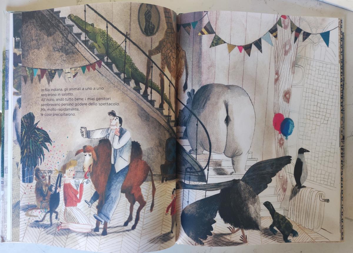 La raffinata scala di casa Snipperpot (Beatrice Alemagna, Il disastrosissimo disastro di Harold Snipperpot, Topipittori, 2018) poco s'addice, se non per contrasto, all'enorme didietro dell'ippopotamo entrato insieme agli altri mammiferi e rettili selvaggi per la grandiosa festa di compleanno del protagonista: l’artificio non riesce a contenere la natura strabordante e la scala è la scena di queste scintille.