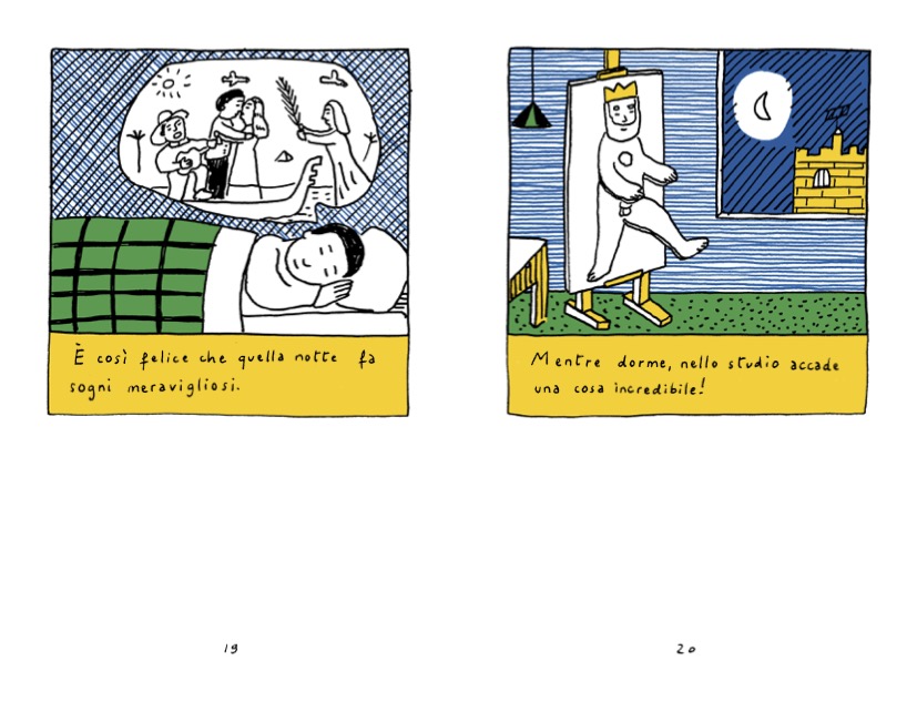 Storia dell’arte, che nel 1999 ha vinto il Bologna Ragazzi Award, è l’ennesimo libro eccentrico di Cox, somigliante a Una storia d’amore, uscito questa primavera, per le scelte cromatiche, il testo scritto a mano, il gusto del paradosso e dei colpi di scena. Fin dal titolo, in questo libro, le attese del lettori sono tradite, nel senso che per quanto il protagonista sia un pittore, in queste pagine non c'è nulla che riguardi la storia dell'arte propriamente detta.