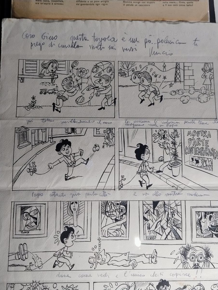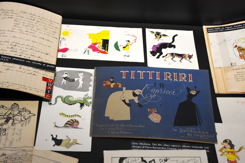 Nel fondo sono conservate anche varie carte relative a La settimana dei ragazzi, rivista illustrata diretta dalla scrittrice dal 1945 al 1947 – in mostra ci sono alcune splendide testimonianze del periodico – assieme (udite, udite!) a lettere e osservazioni dei piccoli lettori e lettrici e a numerosi disegni, bozzetti e prove di stampa per le illustrazioni della rivista. Elisa e Benedetta mi hanno raccontato che le osservazioni dei bambini, che come ben sappiamo sanno essere particolarmente taglienti e a volte lapidari nei loro giudizi, sono molto interessanti, a conferma del fatto che spesso le cosiddette “note a margine” che si trovano sui documenti risultano straordinariamente vitali e significative per la comprensione del documento stesso, indipendentemente dall’età dello scrivente. Naturalmente adesso sono molto curiosa di scoprire cosa hanno scritto i bambini e tornerò presto a farmi viva con le curatrici, ma intanto mi soffermo su un paio di note a margine scritte da adulti e visibili in mostra, come quella dell’illustratore Vinicio Berti a proposito di una tavola “un po’ polemica” de La settimana dei Ragazzi o quella di Fiorenzo Faorzi che si raccomanda di curare le sfumature della neve e del fantoccio in un bozzetto.